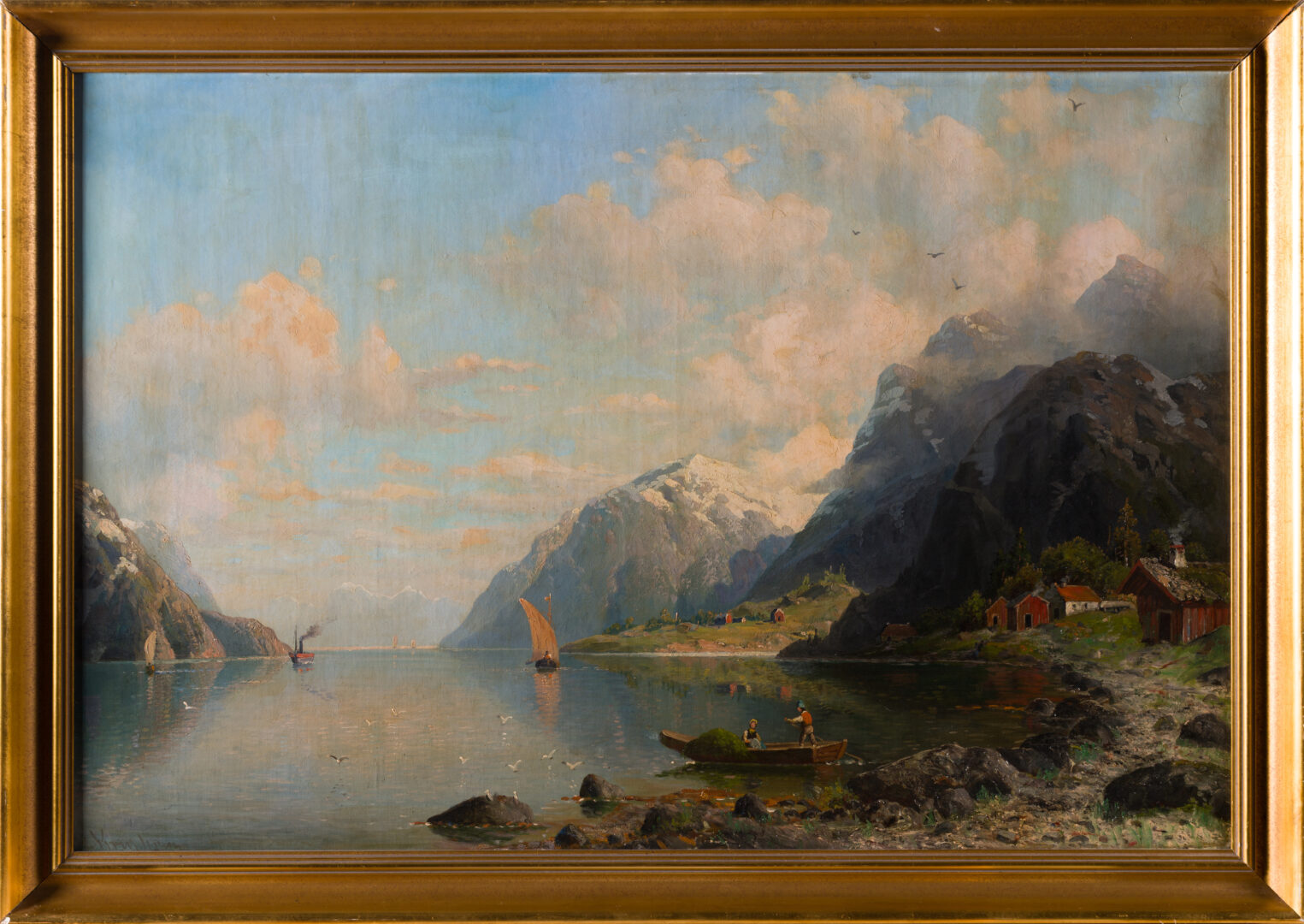 This majestic large-scale oil on canvas is a classic example of 19th-century European landscape painting, executed in the Romantic tradition. The composition captures the awe-inspiring scale of a Northern fjord, where towering, snow-capped peaks rise sharply against a sky filled with atmospheric, shifting clouds. In the foreground, the artist emphasizes the relationship between man and the sublime through the inclusion of a traditional wooden boat with figures and rustic red-painted dwellings along the rocky shoreline.