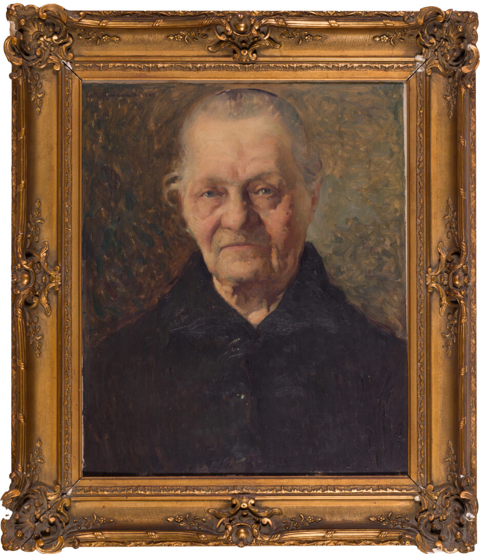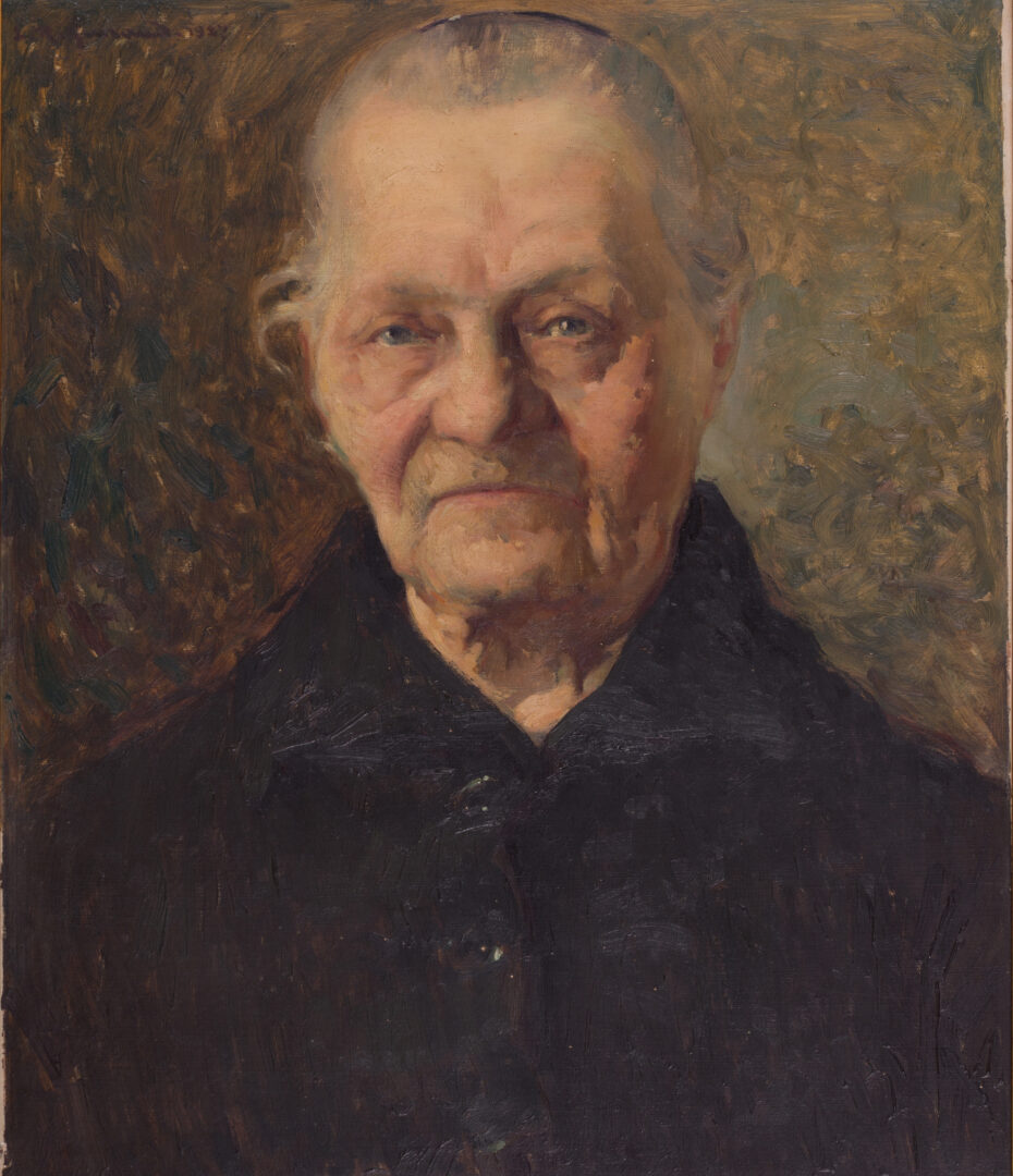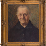 This powerful and dignified oil on canvas portrait depicts an elderly woman, rendered with a profound sense of realism and psychological depth. The subject is presented in a frontal view, dressed in a somber black high-necked garment that emphasizes the weathered, expressive features of her face. The artist utilizes a rich, tonal palette of ochres and umbers in the background, employing vigorous, visible brushwork that creates a vibrant, textured surface contrasting with the smooth, detailed rendering of the woman’s skin.