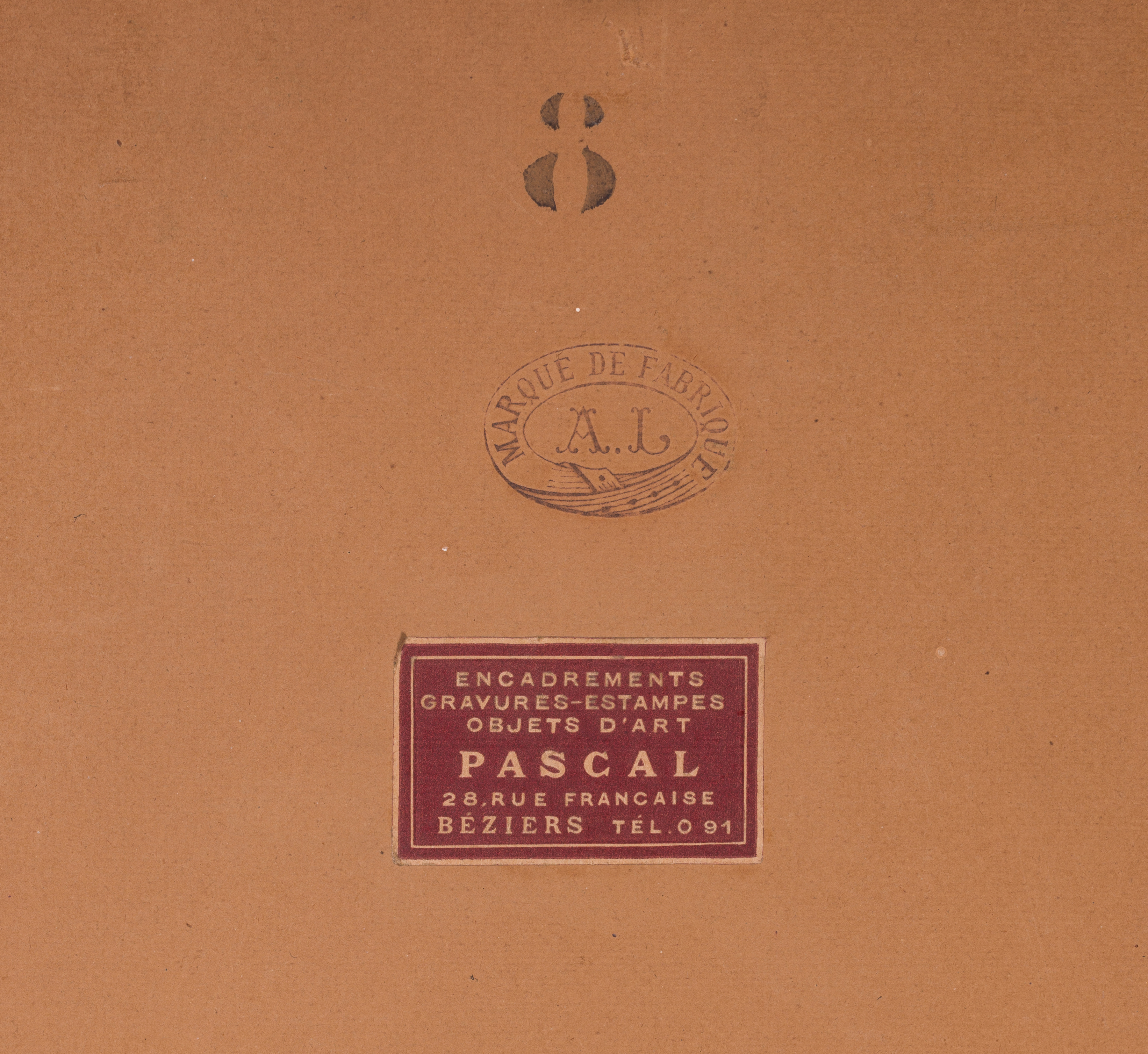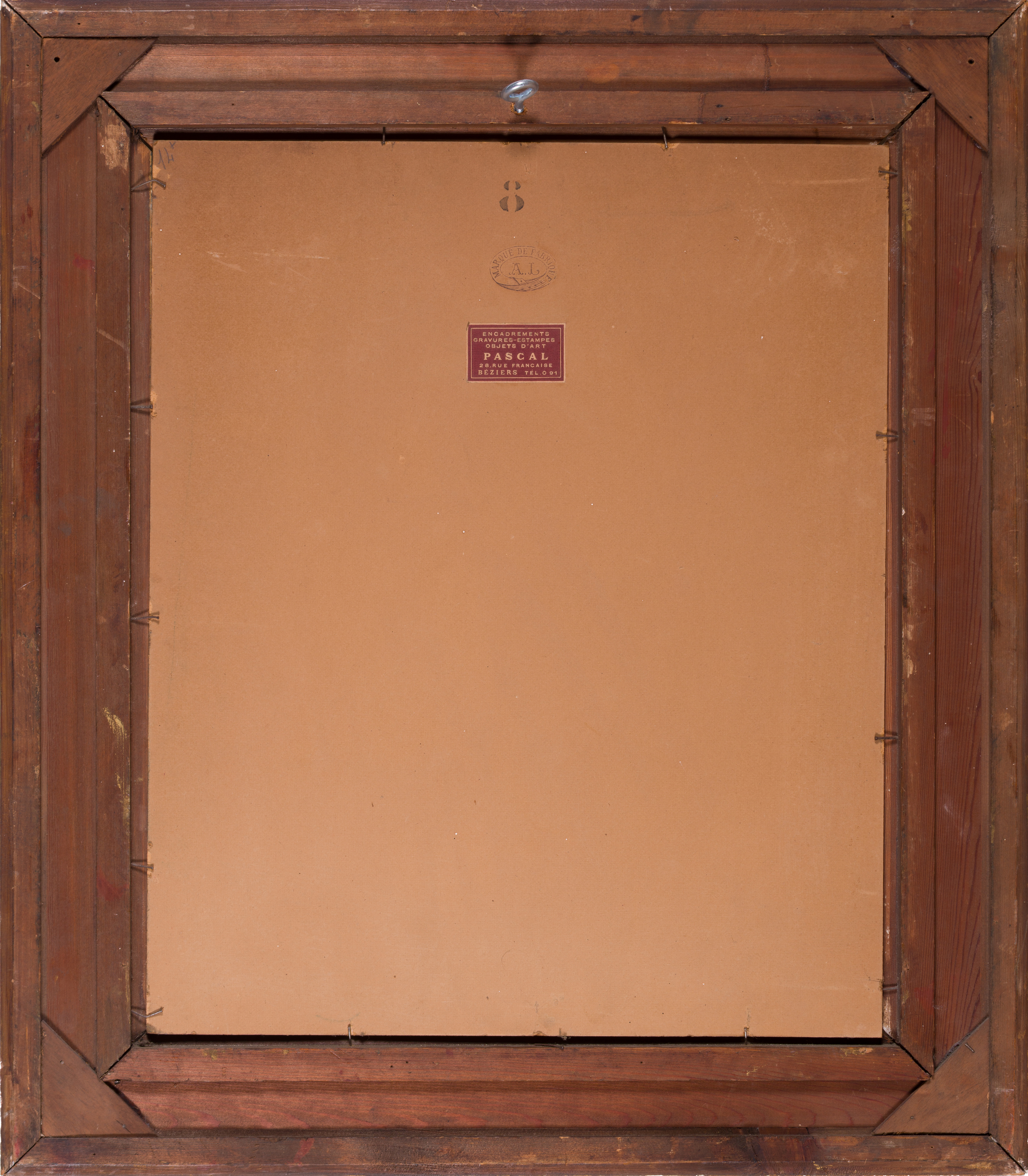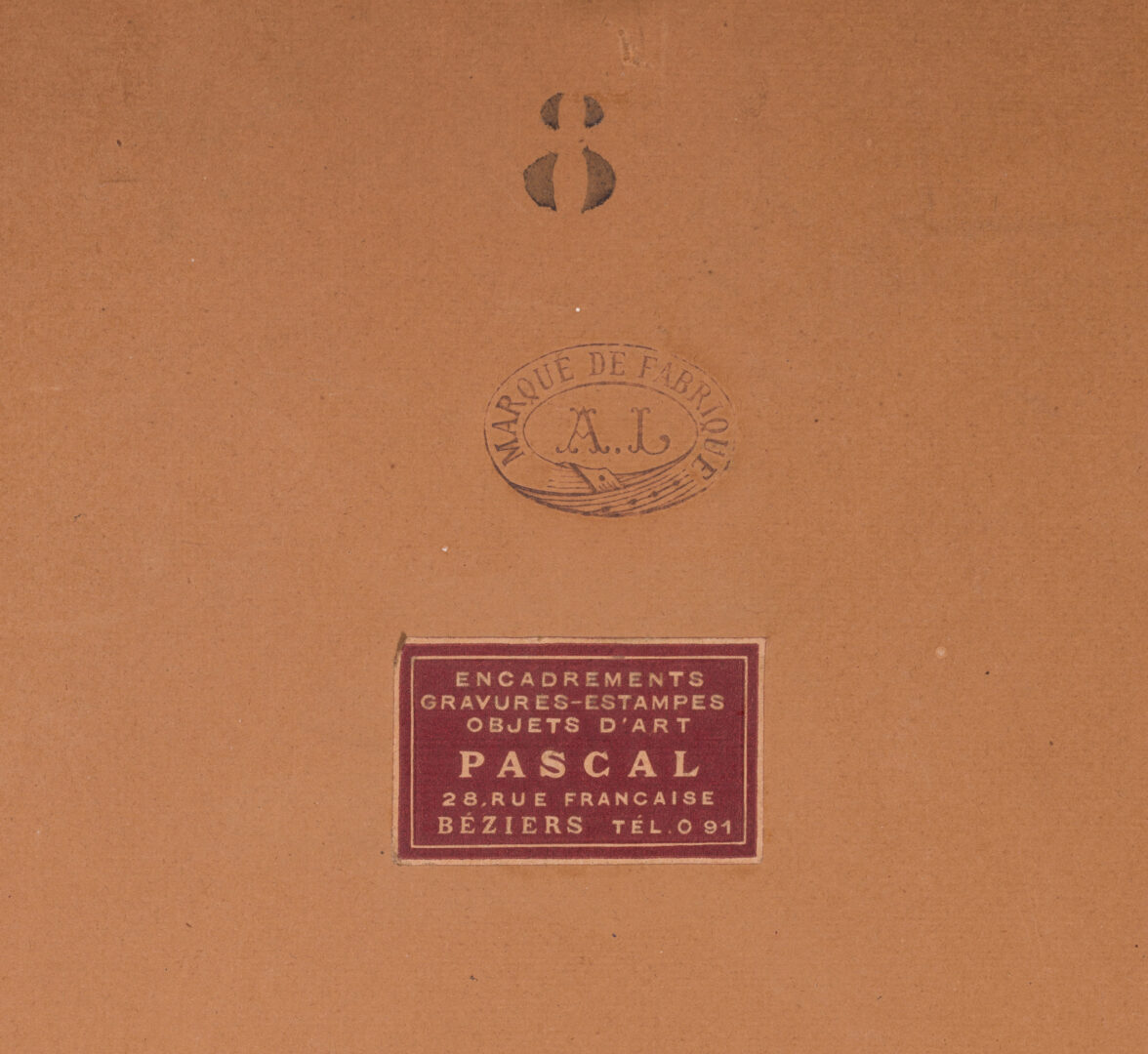 The work reflects the influence of Late Realism or Early Impressionist portraiture, where the focus lies on capturing the character and life history written in the subject’s gaze. The subtle interplay of light across the forehead and cheeks highlights the folds of time, while her steady, direct look provides a sense of quiet resilience. On the reverse, the piece features an antique framer’s label from Pascal in Béziers, France, and a manufacturer’s stamp (A.L.), grounding the work’s provenance in the French artistic tradition of the turn of the century.