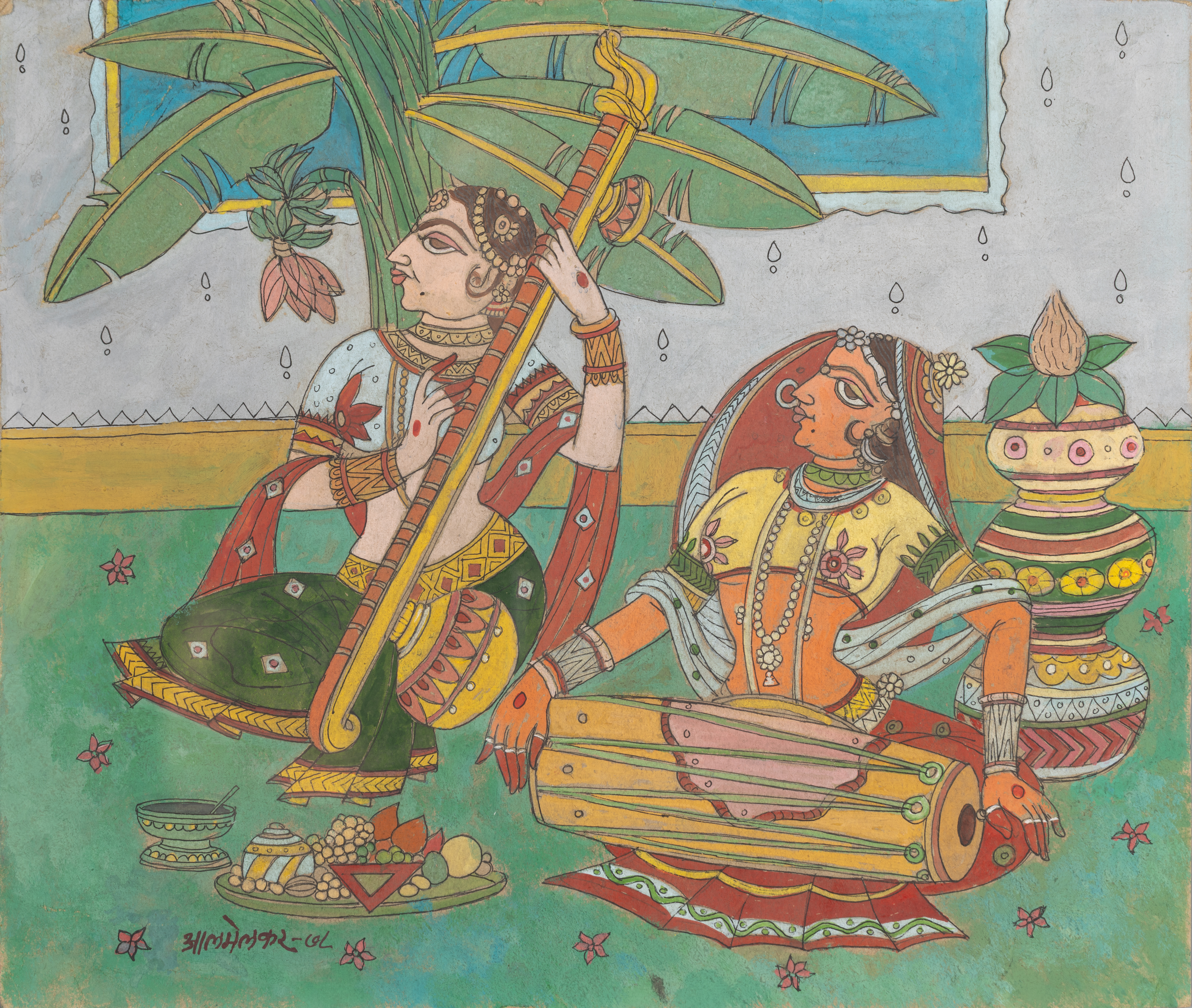 This vibrant mixed media work on paper is a quintessential example of the “Musician Series” by the distinguished Indian painter Abdul Rahim Appabhai Almelkar (1920–1982). Known for his unique blend of traditional Indian themes and modernist techniques, Almelkar here depicts two figures — a veena player and a drummer — under a stylized banana tree. The work is characterized by the artist’s signature bold outlines, rhythmic decorative patterns, and a palette rooted in Indian folklore and rural life. A prominent figure in the post-independence art scene, Almelkar’s work in this series reflects his deep fascination with the dynamism of Indian performing arts.