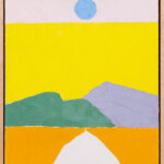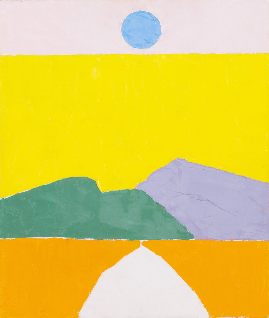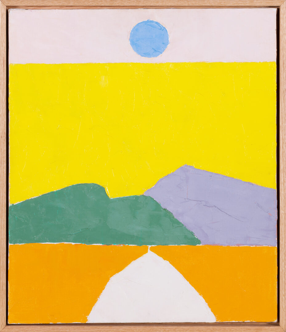 This vibrant oil on canvas is a compelling example of the minimalist landscape abstraction associated with the style of Etel Adnan. The composition reduces the natural world to its most essential forms: flat, interlocking planes of saturated color that evoke mountains, fields, and a central path under a solid blue celestial body. The use of a bold, non-naturalistic palette—pink, sulfur yellow, violet, and orange—creates a rhythmic, poetic resonance typical of late-period modernist abstraction.