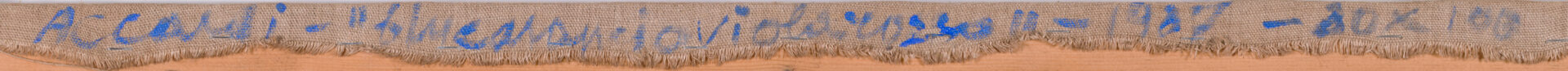 This energetic acrylic on canvas is a quintessential example of Carla Accardi’s rhythmic abstraction from the late 1980s. A founding member of the influential Forma 1 group, Accardi spent her career exploring the expressive potential of signs and calligraphic forms. In “Bianco Rosso Viola” (1987), she utilizes a sophisticated interlocking pattern of vibrant cerulean blue, deep magenta, and lavender-purple, all outlined in a warm orange. The forms appear to float over a raw, unprimed canvas ground, creating a fascinating tension between the industrial precision of the shapes and the organic texture of the support.