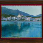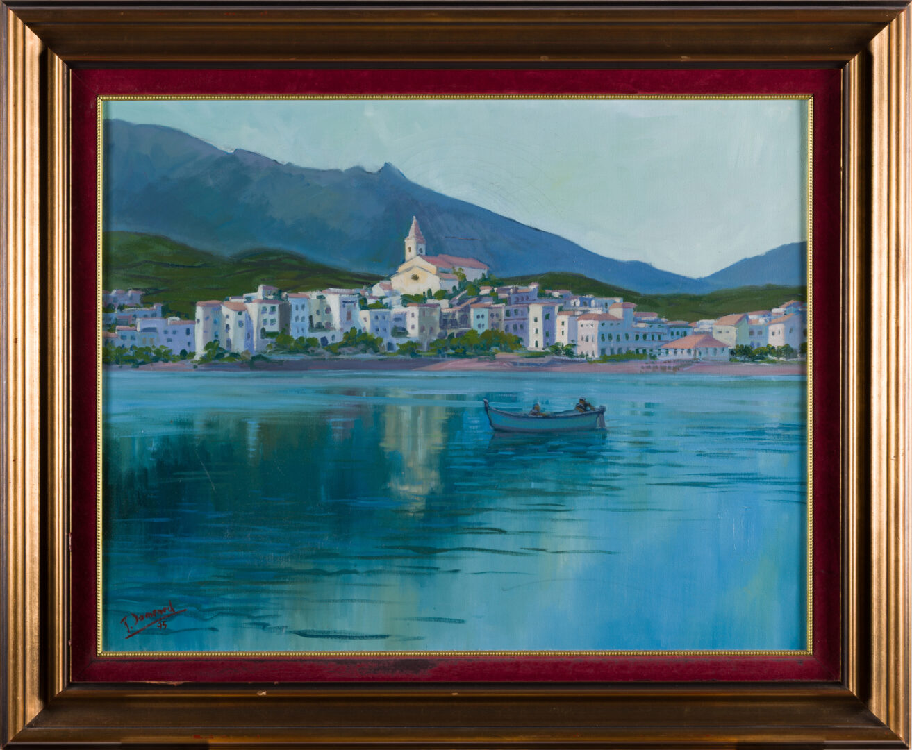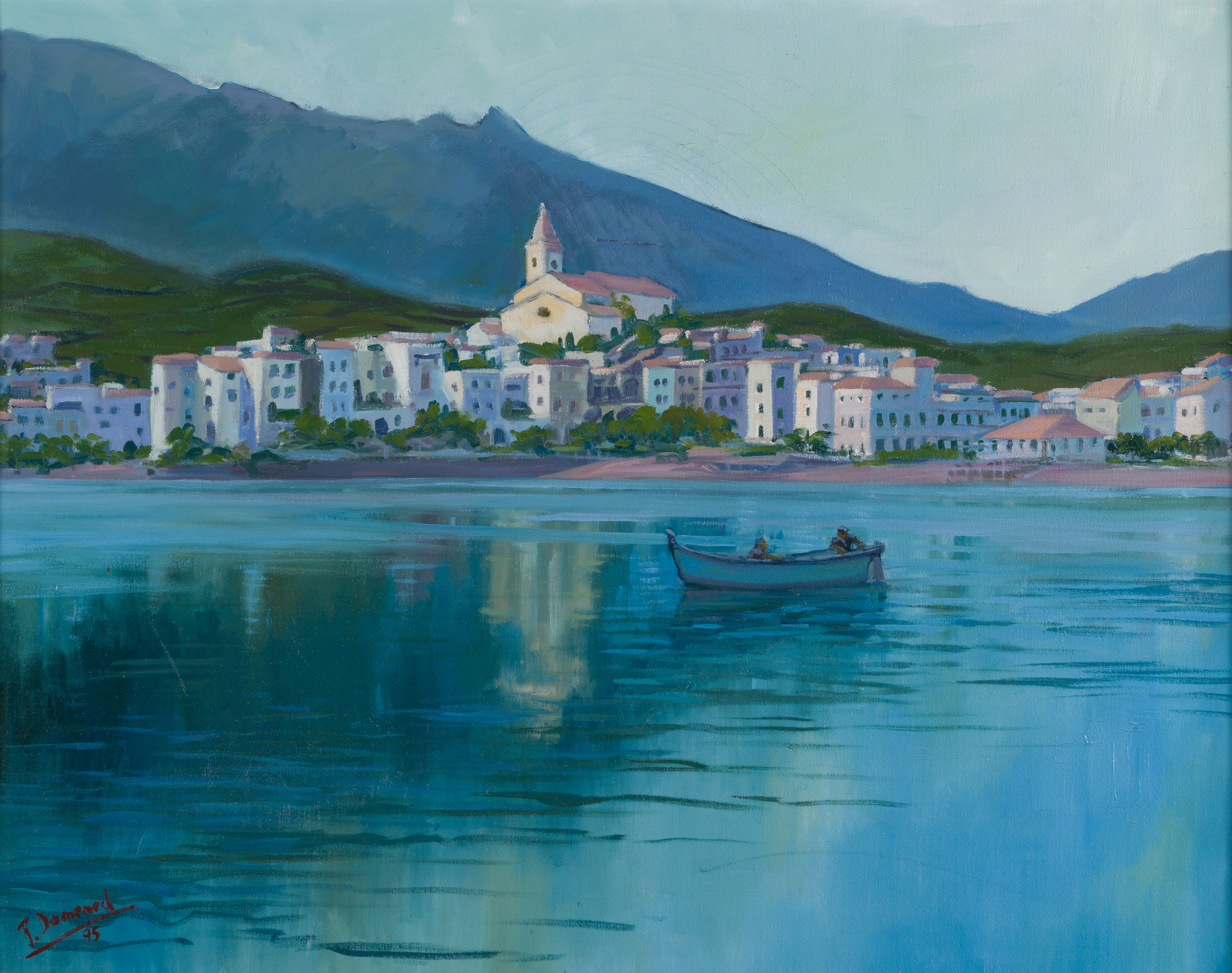 This serene oil on canvas depicts a picturesque Mediterranean coastal town, likely along the Costa Brava. The composition features a row of sun-drenched, white-washed buildings nestled at the base of a soft blue mountain range, with a central church spire puncturing the skyline. In the foreground, a traditional wooden fishing boat with two figures rests on the calm, turquoise waters, which beautifully mirror the coastal architecture and the hazy light of a clear day.