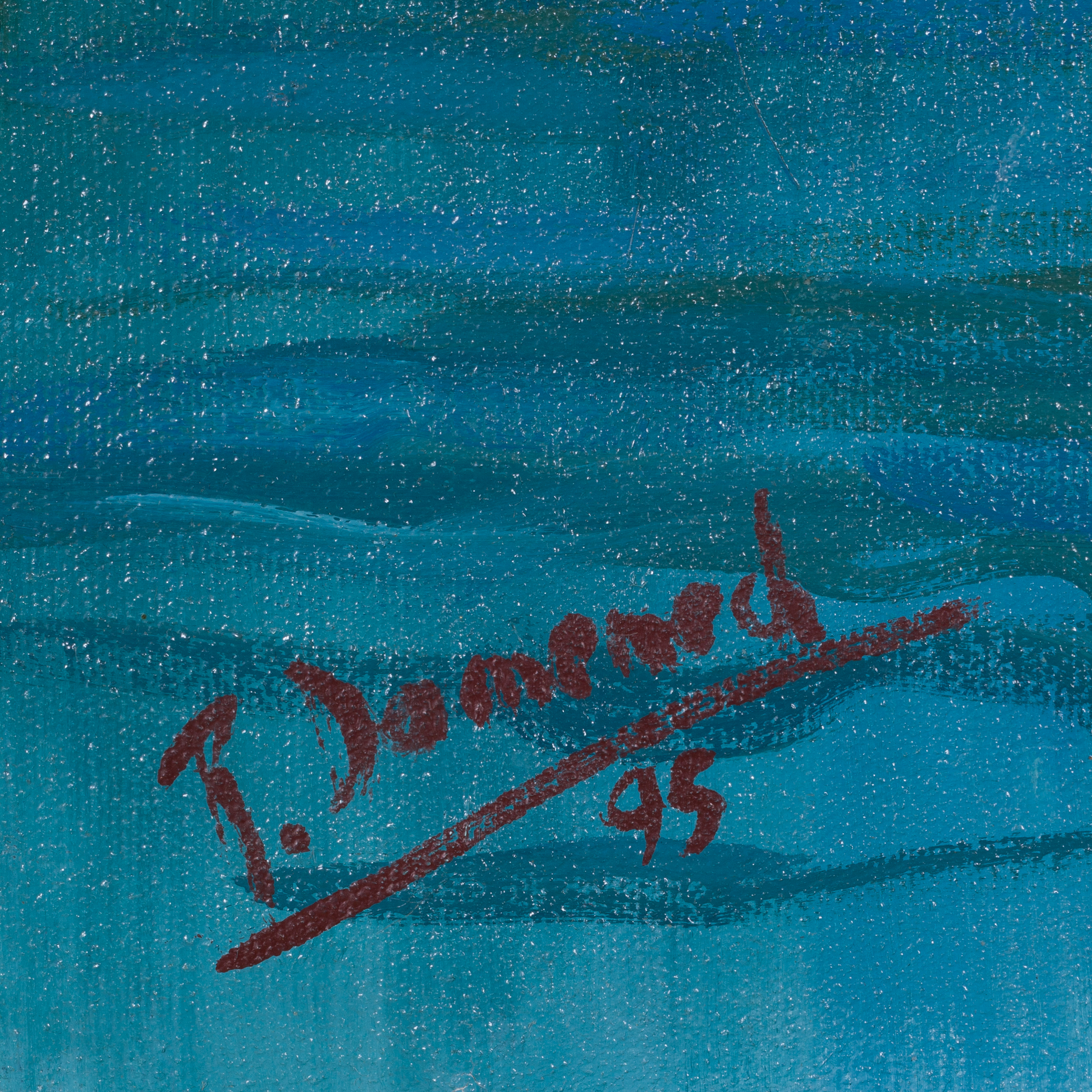 The work is signed “J. Domènech” and dated ’95 in a bold red script in the lower-left corner. The artist employs a balanced, naturalistic palette and fluid brushwork to capture the peaceful, rhythmic atmosphere of seaside life. Housed in a classic tiered wooden frame with a deep burgundy velvet inlay and gold-toned accents, the painting is in excellent condition. This piece is a quintessential example of late 20th-century Spanish landscape painting, ideal for adding a sense of Mediterranean tranquility to a collection.