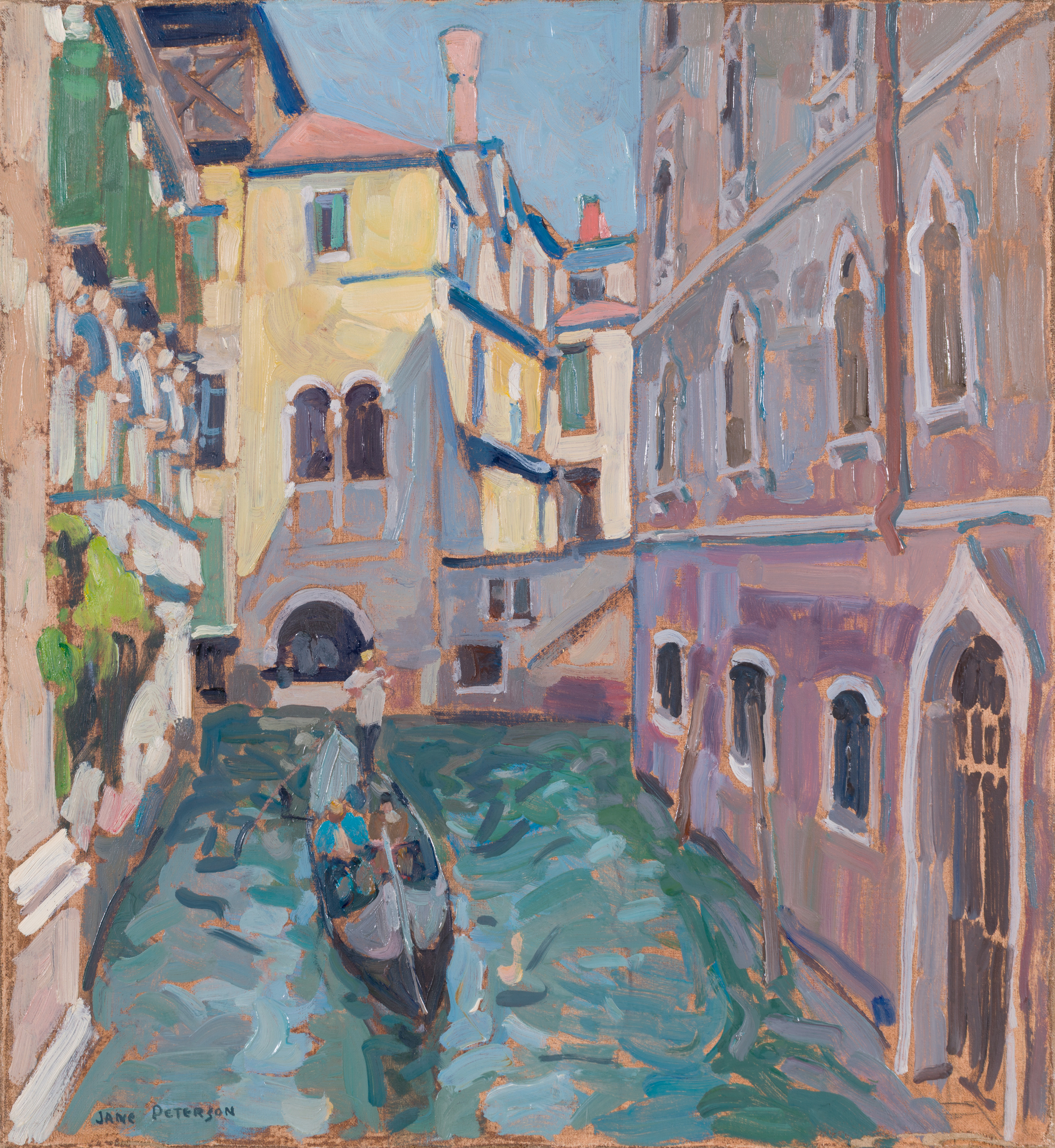 This evocative oil on canvas captures the timeless allure of Venice through the lens of Jane Peterson’s signature style—a vibrant fusion of American Impressionism and European Fauvism. The composition focuses on a narrow canal, where a gondolier expertly maneuvers his craft past historic palazzos. Peterson utilizes a sophisticated palette of dusty violets, ochres, and sun-drenched yellows, contrasted by the deep, shimmering greens of the canal water.