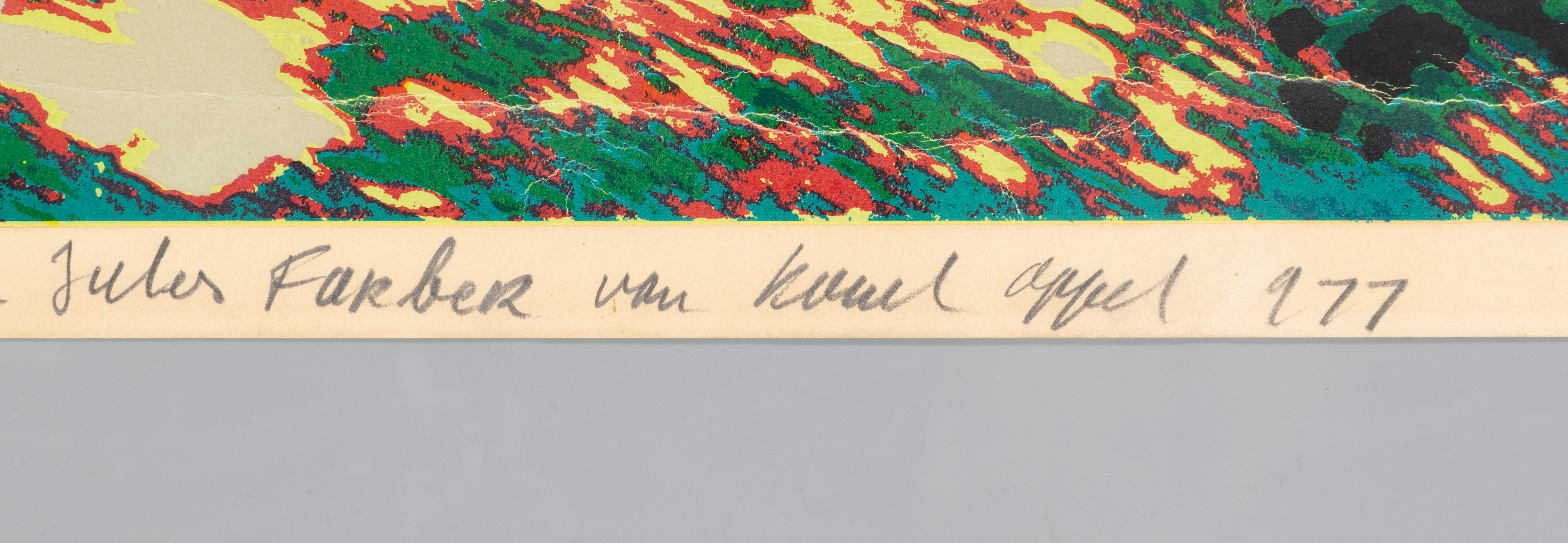 The piece is hand-signed and dated “Appel ’77” in pencil in the lower right margin. It also bears a personalized handwritten dedication in the lower-left: “voor Jules Farber van Karel Appel 1977” (For Jules Farber from Karel Appel 1977), as well as the initials “e.a.” (épreuve d’artiste), identifying it as a rare artist’s proof outside the regular edition.