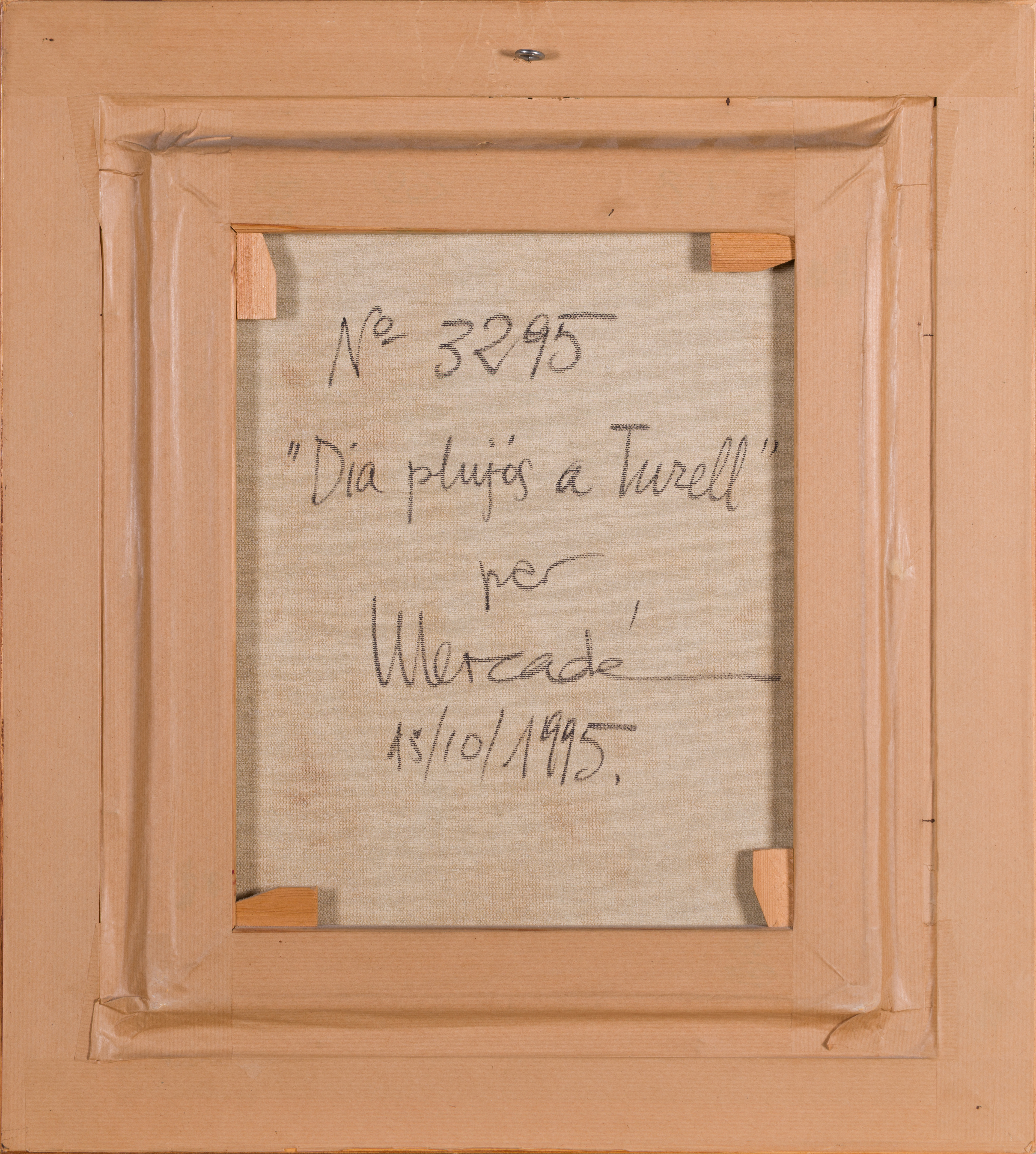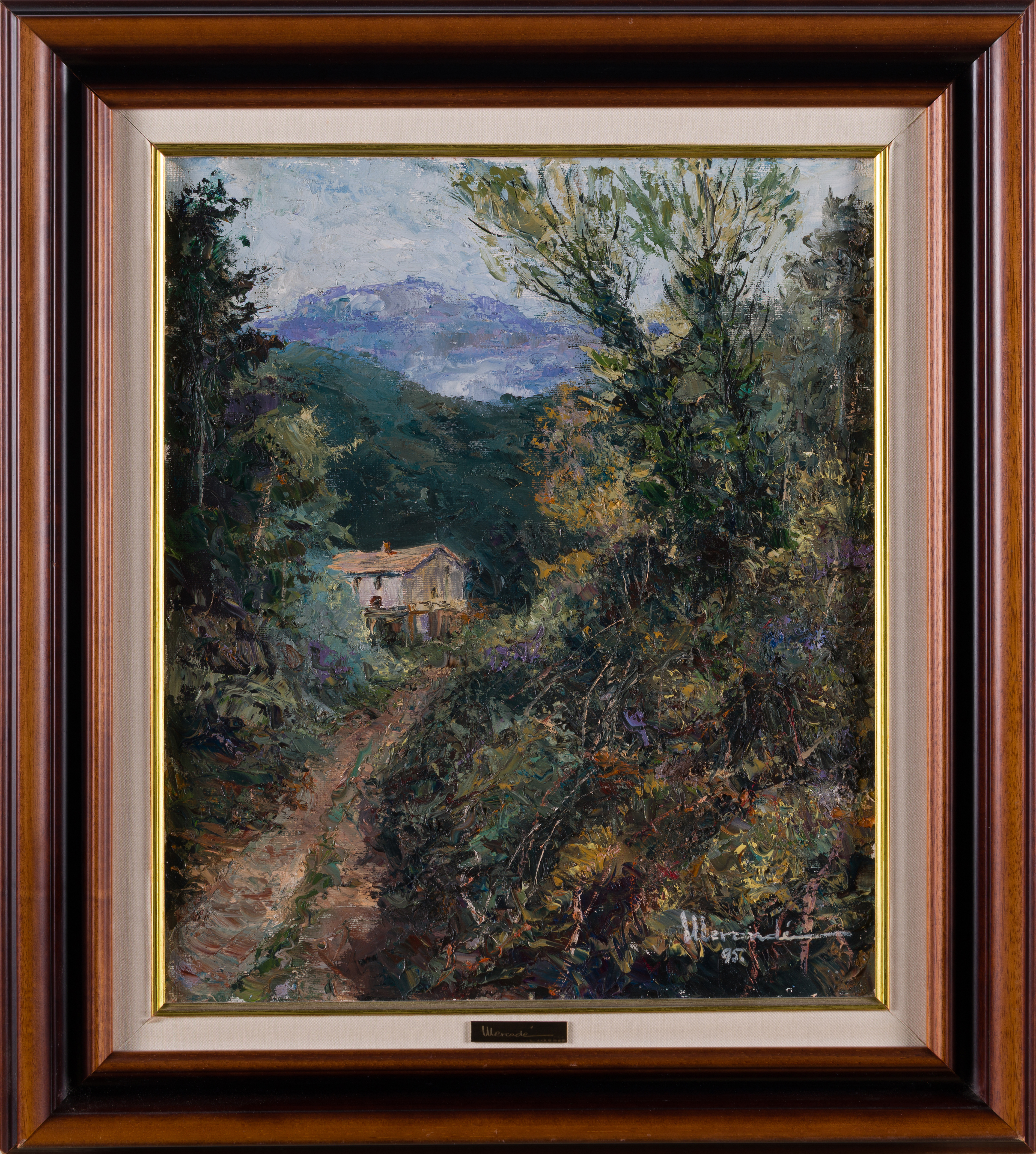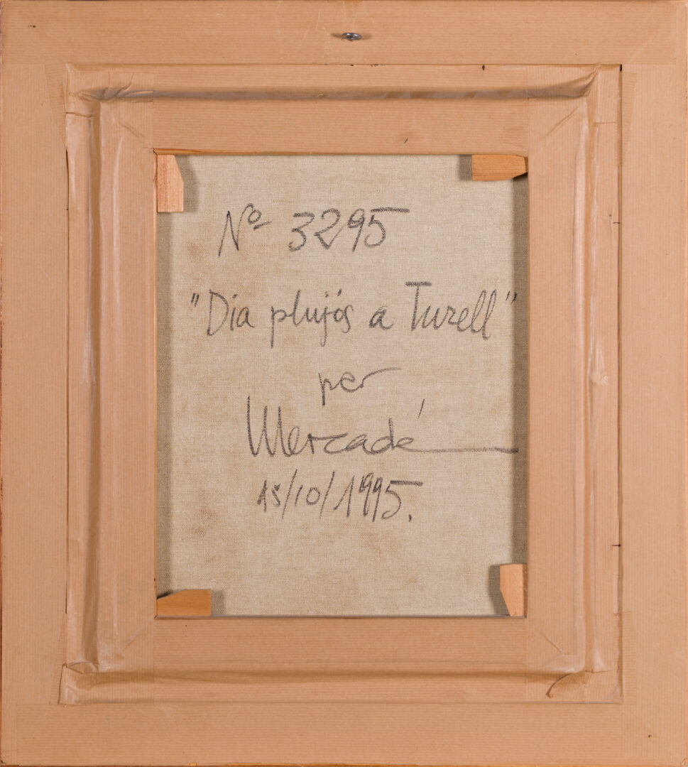 The work is signed “Mercadé” and dated ’95 in white impasto in the lower-right corner. The technique is characterized by a vigorous, almost frantic application of paint, using thick, gestural brushstrokes to convey the movement of wind and the texture of wet vegetation. Detailed inscriptions on the reverse confirm the title, date (15/10/1995), and the inventory number 3295. Housed in a substantial dark wood frame with a gold inner lip and linen mat, the piece is in excellent condition, offering a powerful example of modern Catalan landscape expressionism.