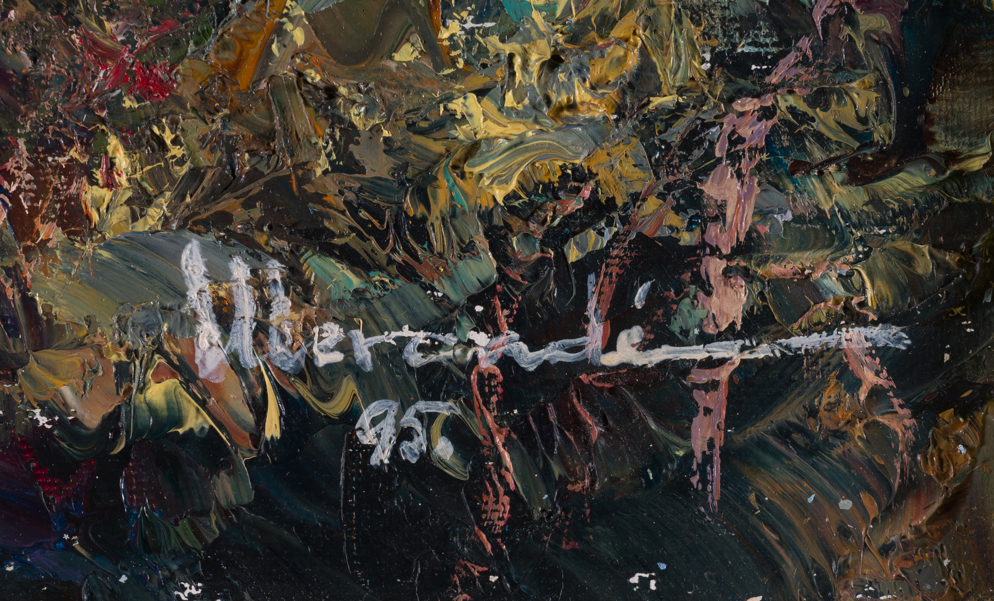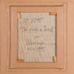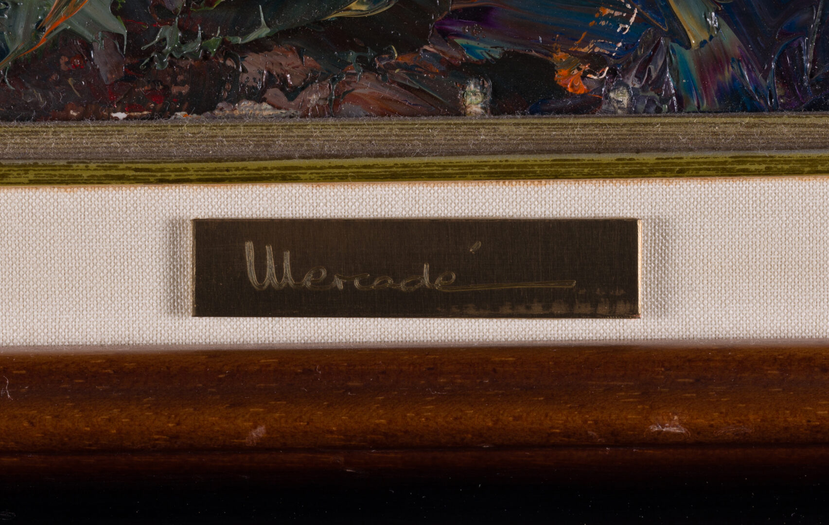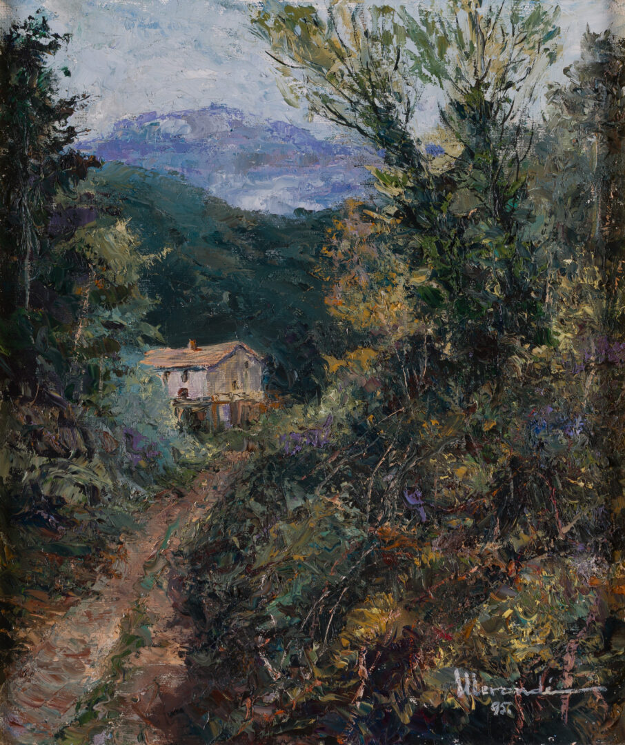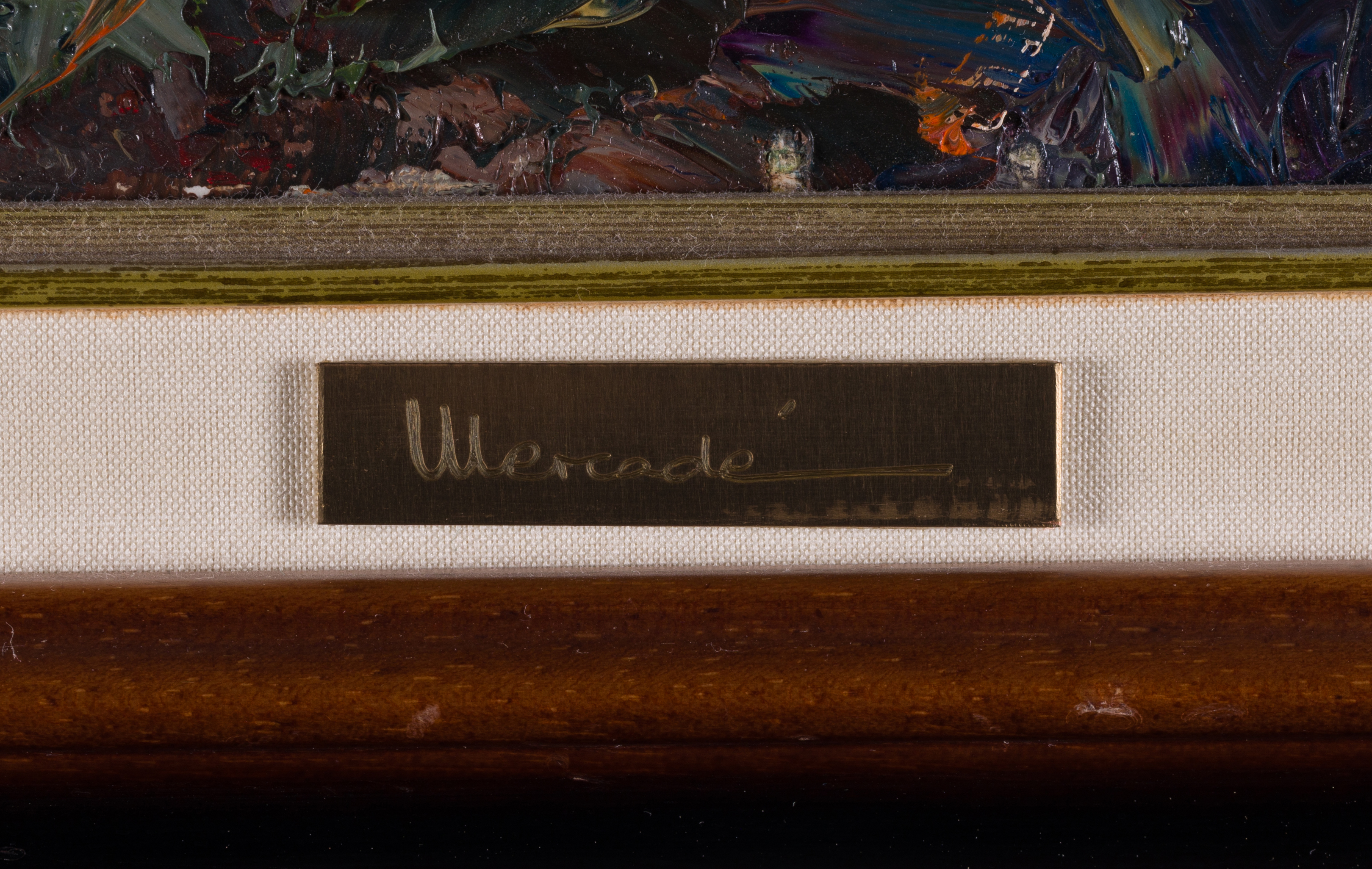 The work is signed “Mercadé” and dated ’95 in white impasto in the lower-right corner. The technique is characterized by a vigorous, almost frantic application of paint, using thick, gestural brushstrokes to convey the movement of wind and the texture of wet vegetation. Detailed inscriptions on the reverse confirm the title, date (15/10/1995), and the inventory number 3295. Housed in a substantial dark wood frame with a gold inner lip and linen mat, the piece is in excellent condition, offering a powerful example of modern Catalan landscape expressionism.