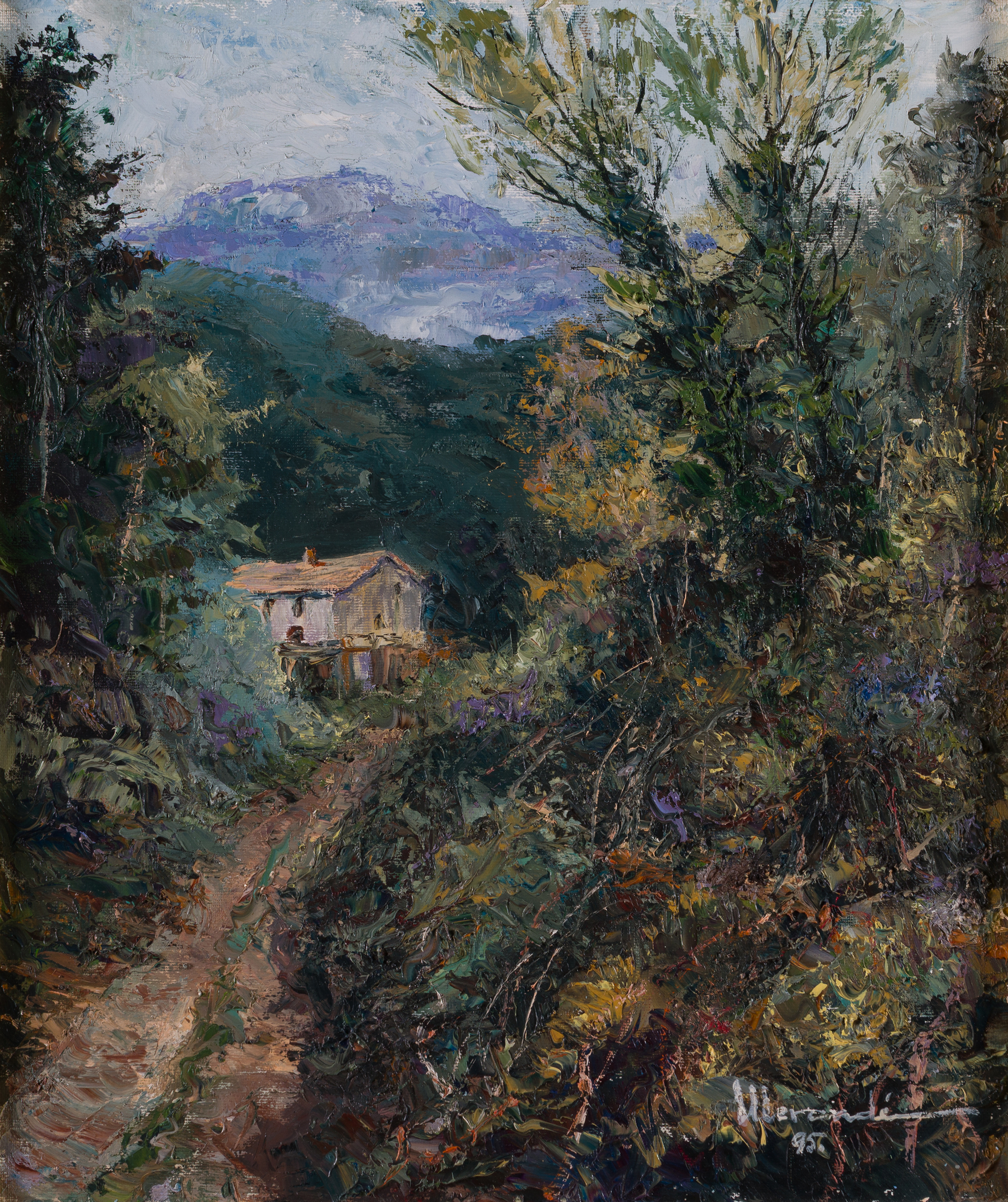 This expressive oil on canvas captures the moody, atmospheric light of a rain-swept landscape in rural Catalonia. The composition is viewed from a forest path, looking through a frame of dense, dark foliage toward a solitary, white-washed farmhouse (masia) nestled against a looming, mist-shrouded mountain. The artist utilizes a deep, earth-toned palette of forest greens, charcoal, and ochre, punctuated by the bright, reflective white of the building’s walls.
