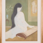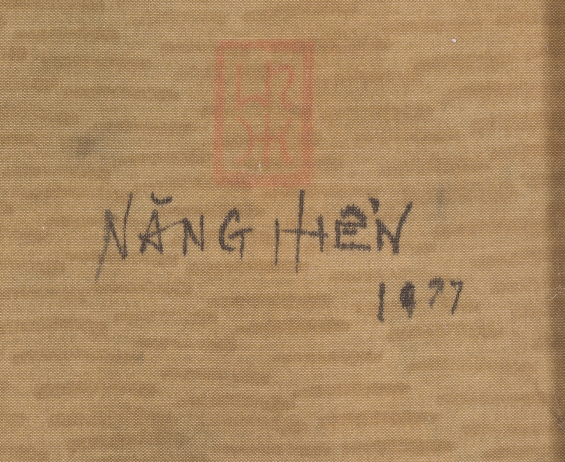 The work is signed “Năng Hiển” and dated “1977” in the lower right corner, accompanied by a traditional red seal. The level of detail—from the flowing black hair of the musician to the delicate blossoms in the background—demonstrates a high degree of technical skill and emotional sensitivity. Housed in a classic gilded frame with a wide white mat, the painting is in excellent condition, offering a timeless representation of cultural heritage and musical grace.