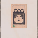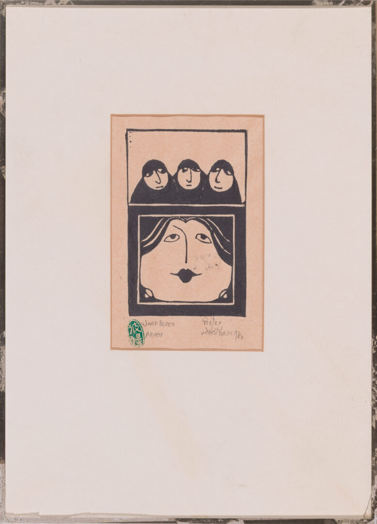 This compelling woodblock proof is a significant example of Pieter van der Westhuizen’s graphic mastery. The composition features four stylized faces arranged in a tight, geometric configuration, showcasing the artist’s ability to blend modernist structural rigor with expressive, rhythmic lines.