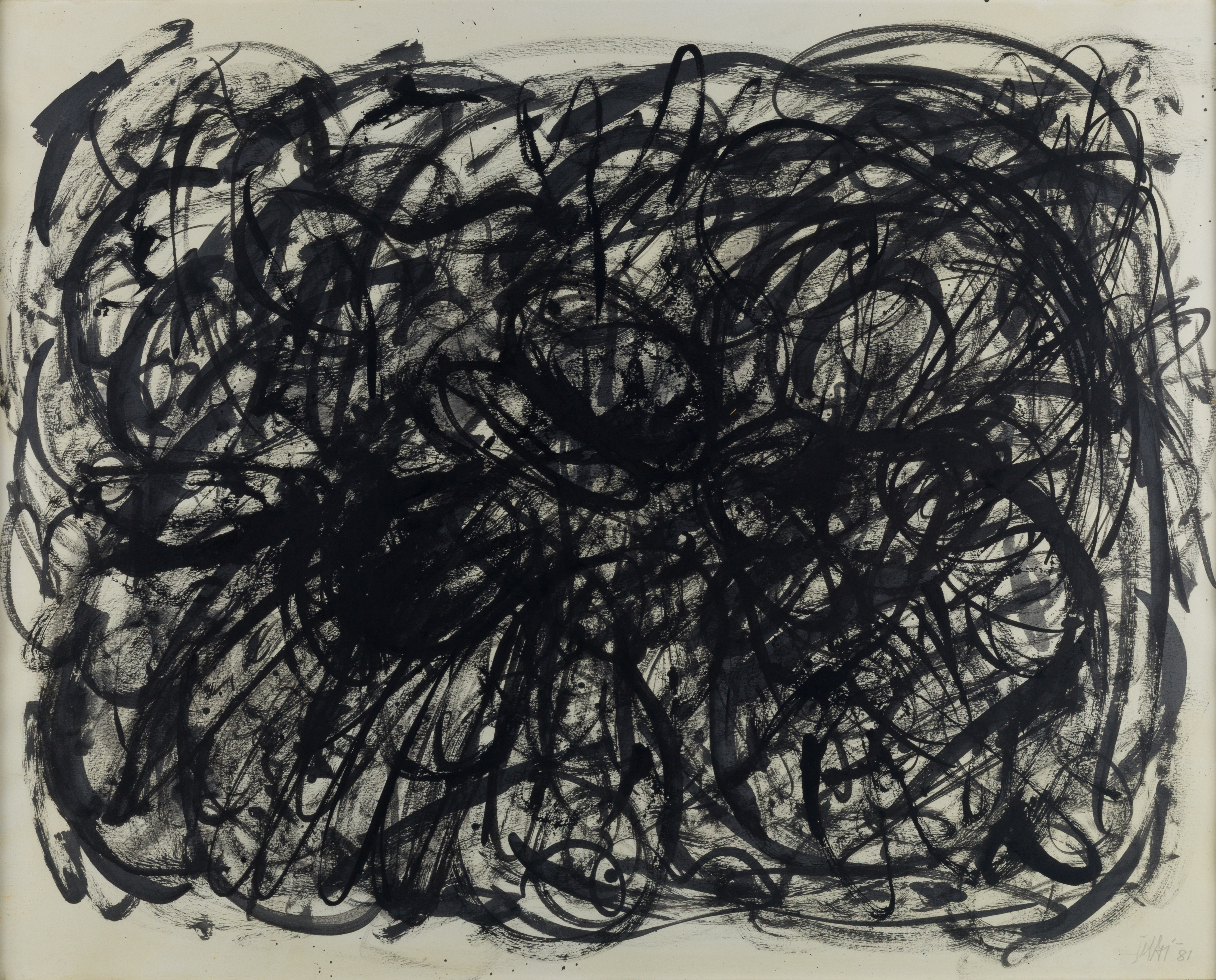 Toshimitsu Imai’s Untitled (1981) is the culmination of the artist’s late work where he combined gestural abstraction and Eastern calligraphy. Black ink arcs flow and collide on the paper like the Art Informel movement he was part of in post-war Paris. The surface is expressive of control and spontaneity — each stroke full of intention, rhythm and movement.