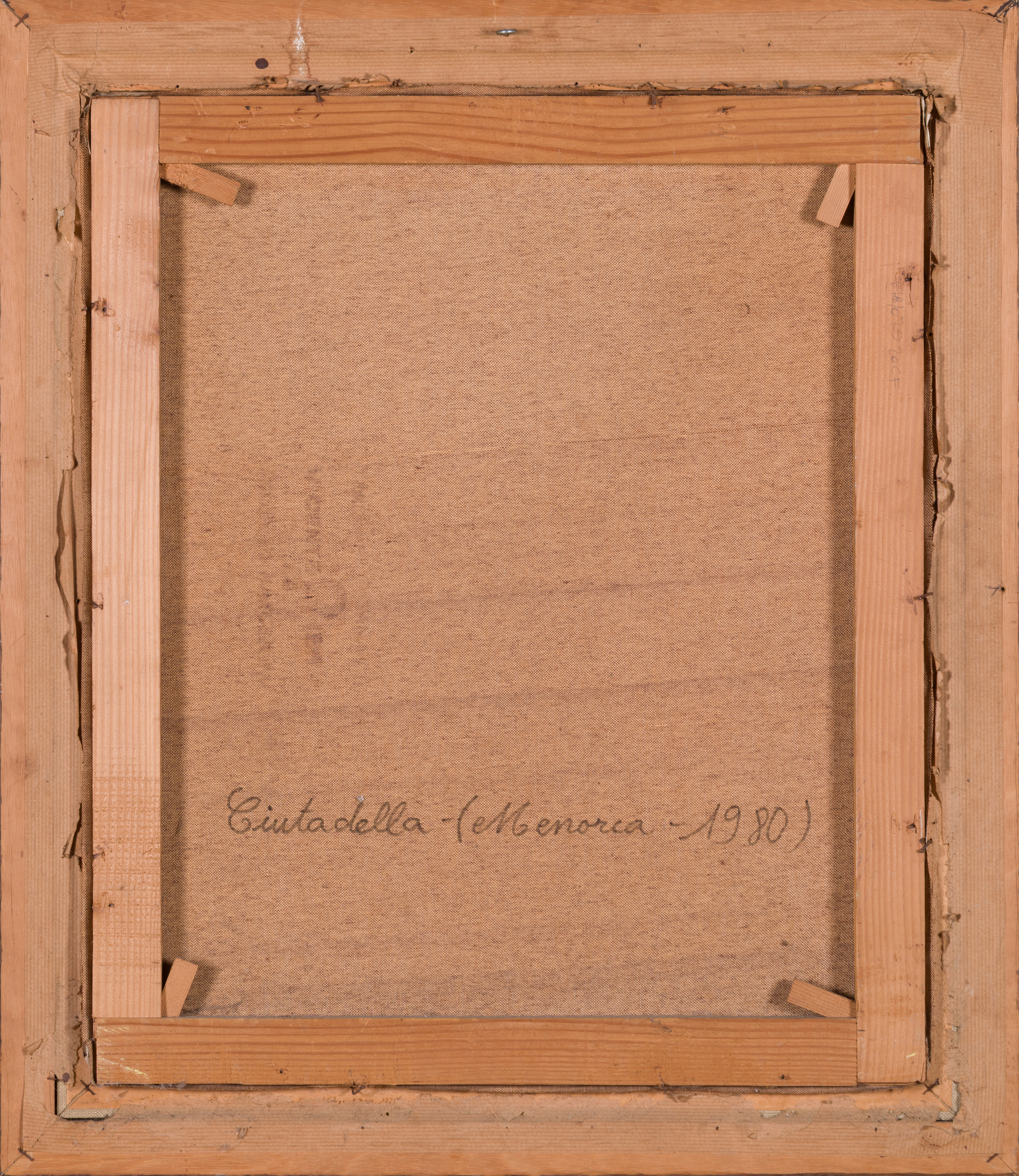 The piece is signed “V.M. Costa” in the lower right corner, with the location and date—”Ciutadella (Menorca – 1980)”—neatly inscribed by the artist on the reverse of the canvas. The brushwork is precise yet fluid, effectively capturing the reflections of the boats and the coastal buildings in the calm harbor waters. Housed in its original wooden frame with a fabric-textured inlay, the painting remains in excellent condition, serving as a nostalgic and sophisticated tribute to Spanish coastal life.