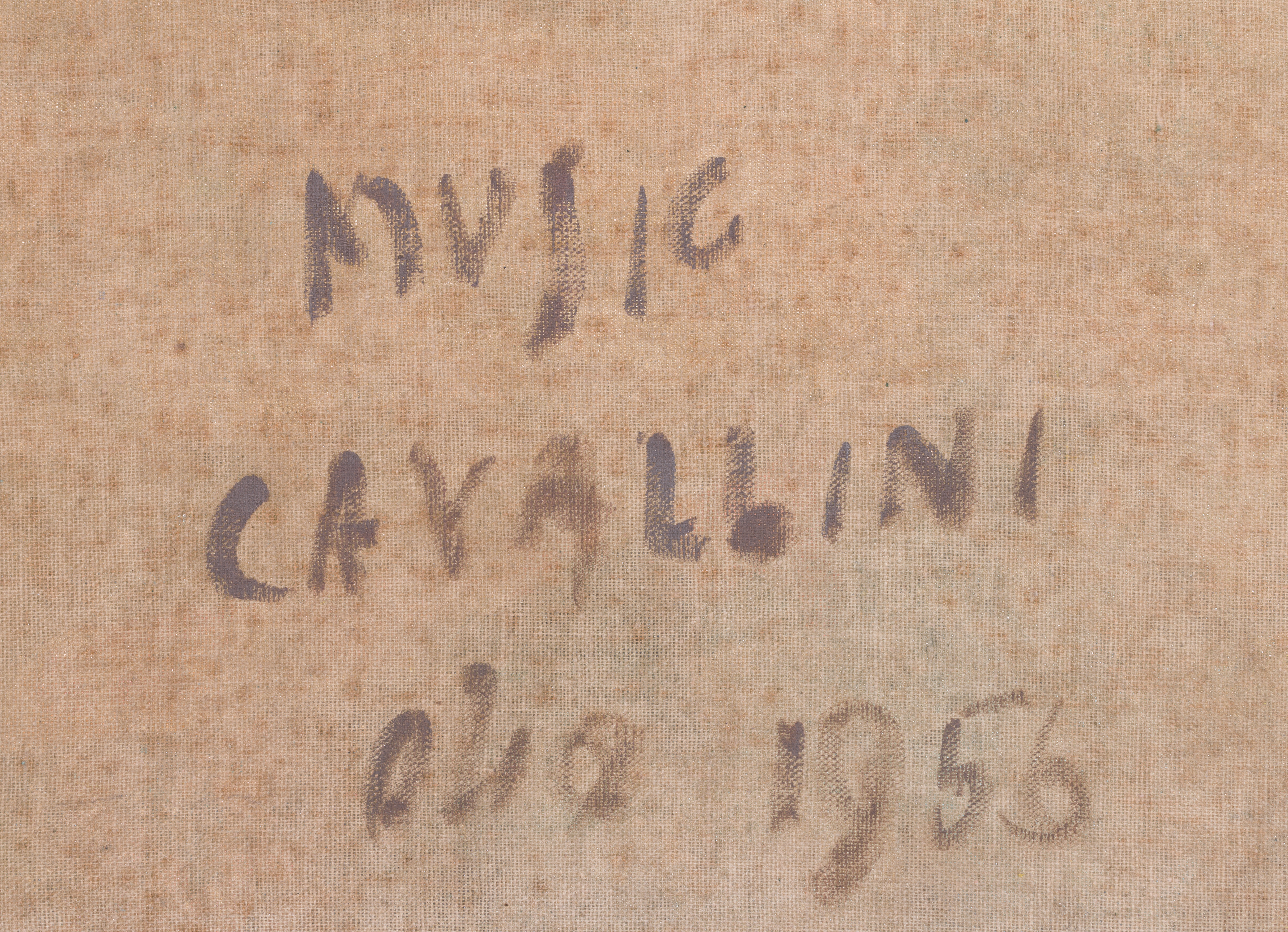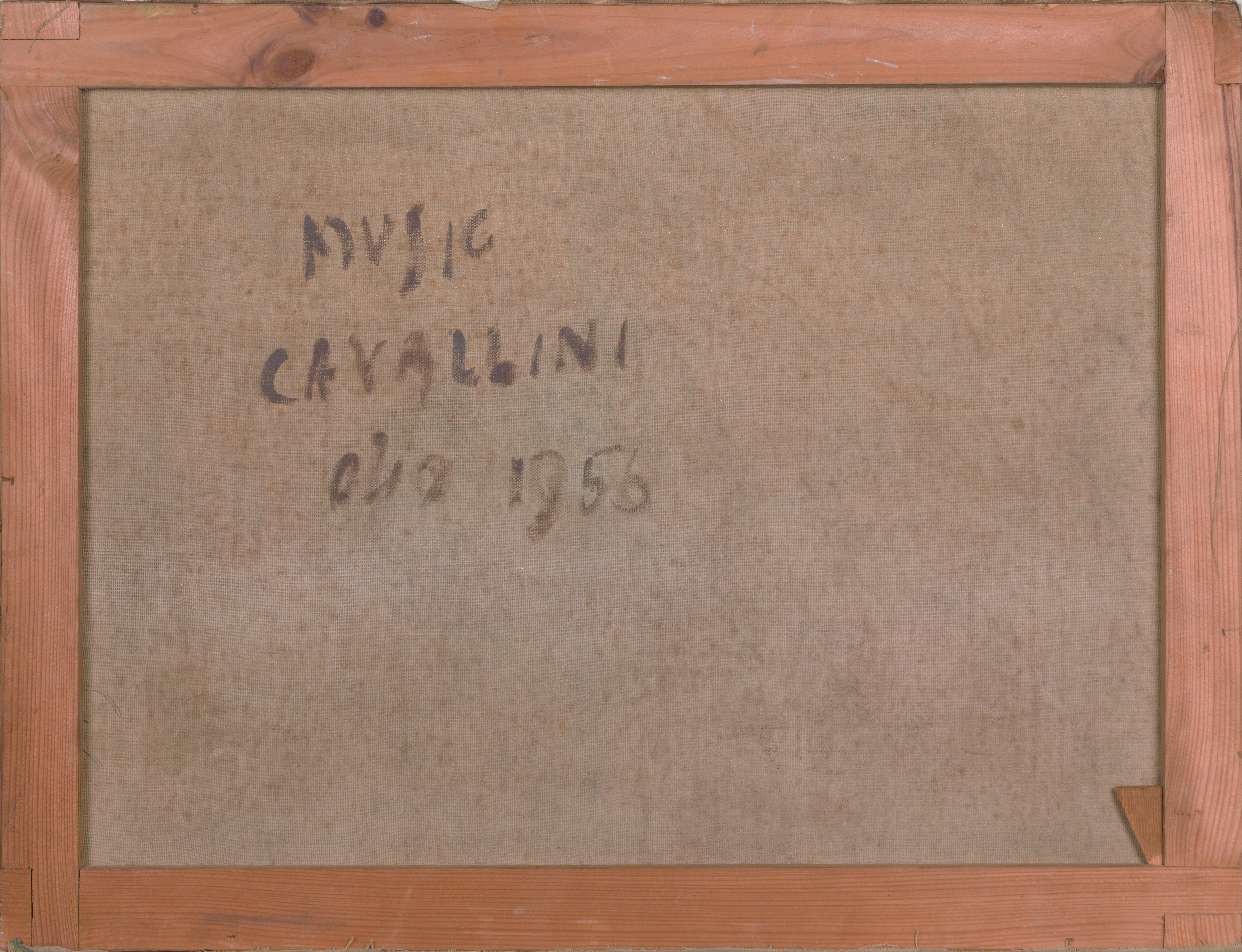 Signed and dated lower center “1956 MUSIC”; further signed, titled, and dated on the reverse.