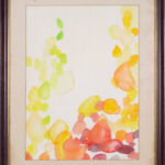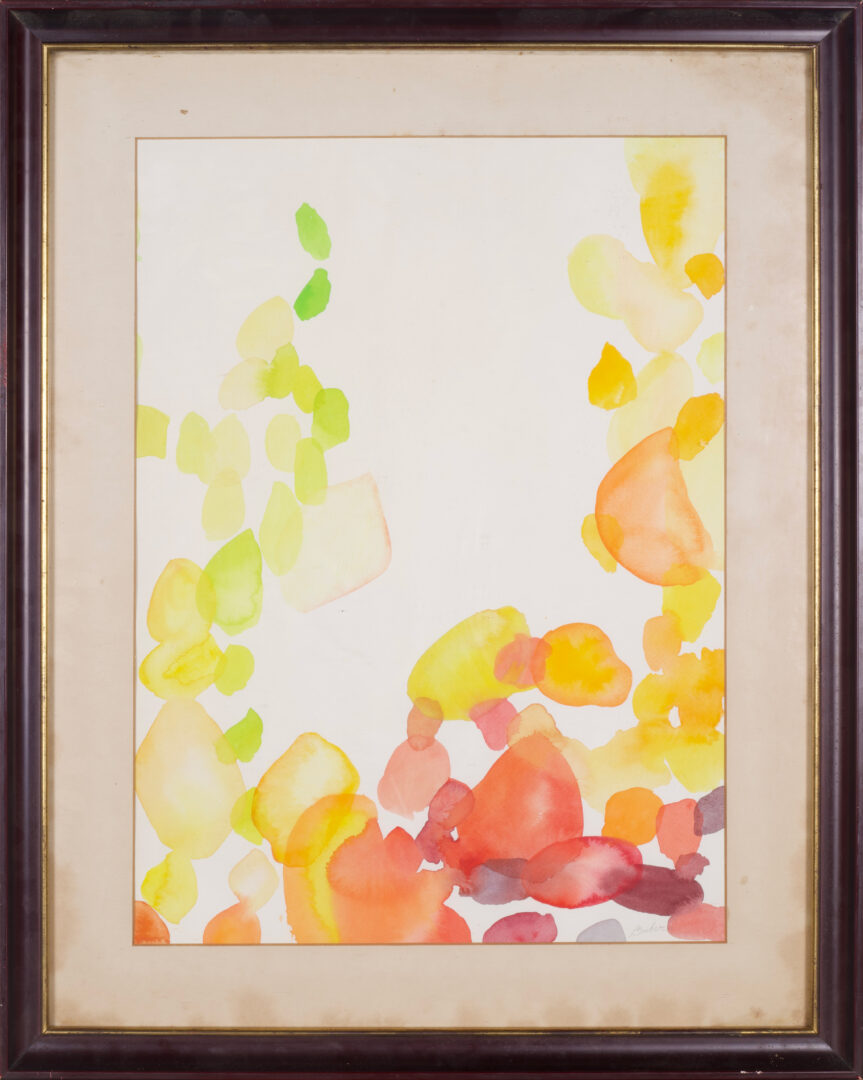 This luminous watercolor on paper is a quintessential example of Alice Baber’s exploration of “color light” and organic abstraction. The composition features her signature translucent, overlapping orbs in a vibrant palette of amber, crimson, and soft yellows, creating a sense of fluid movement and radiant depth across the page.