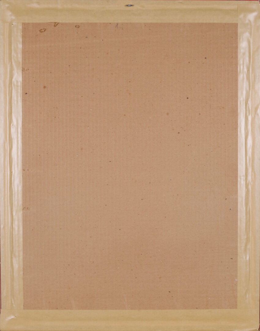 he work is in good overall condition with vibrant colors. Minor age-related toning is visible along the edges, consistent with age. Housed in a dark wooden frame with a gold inner lip. The frame shows light surface wear and some foxing/staining on the matting. The back of the frame is sealed with brown craft paper, which shows typical signs of aging.