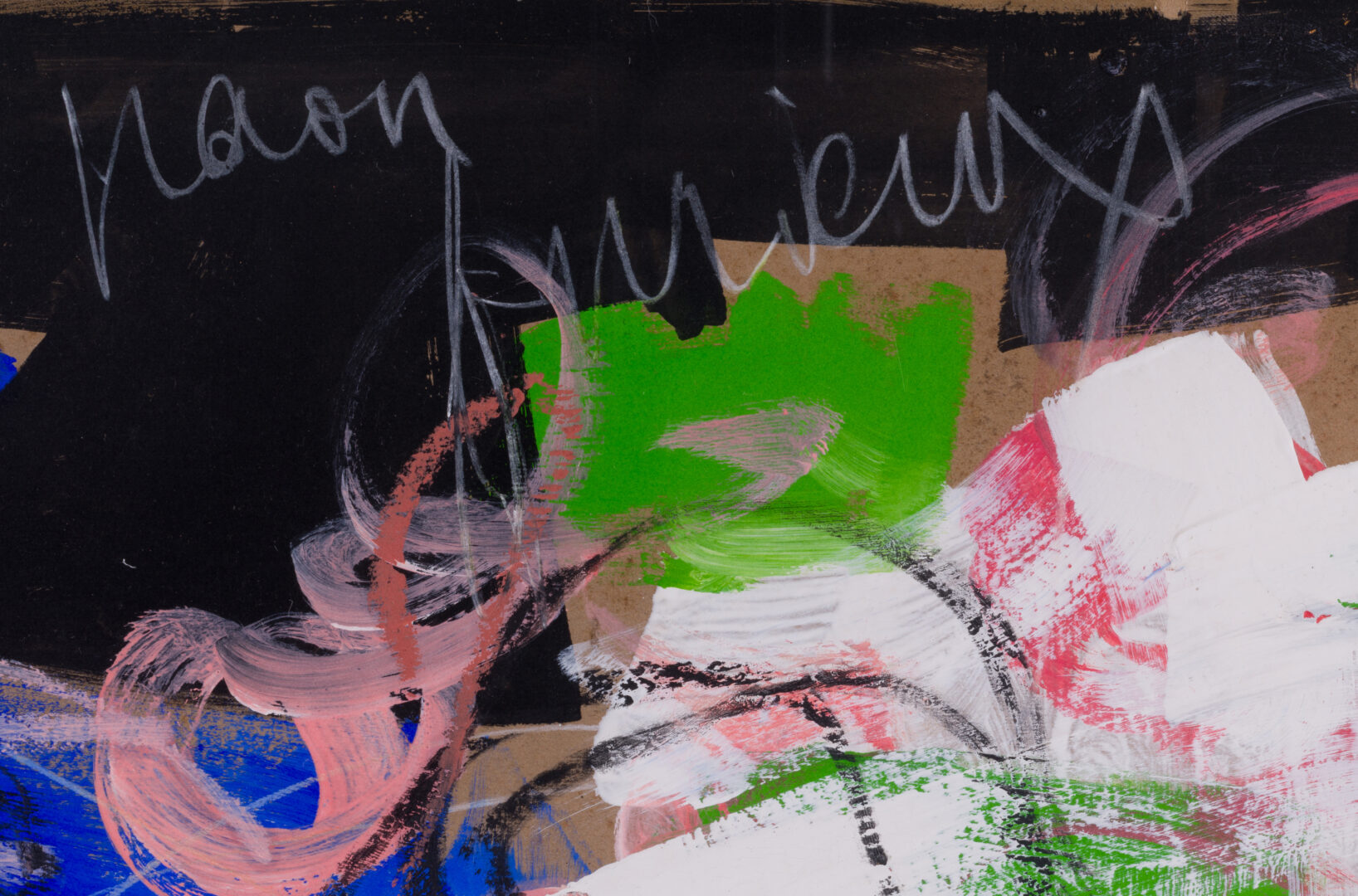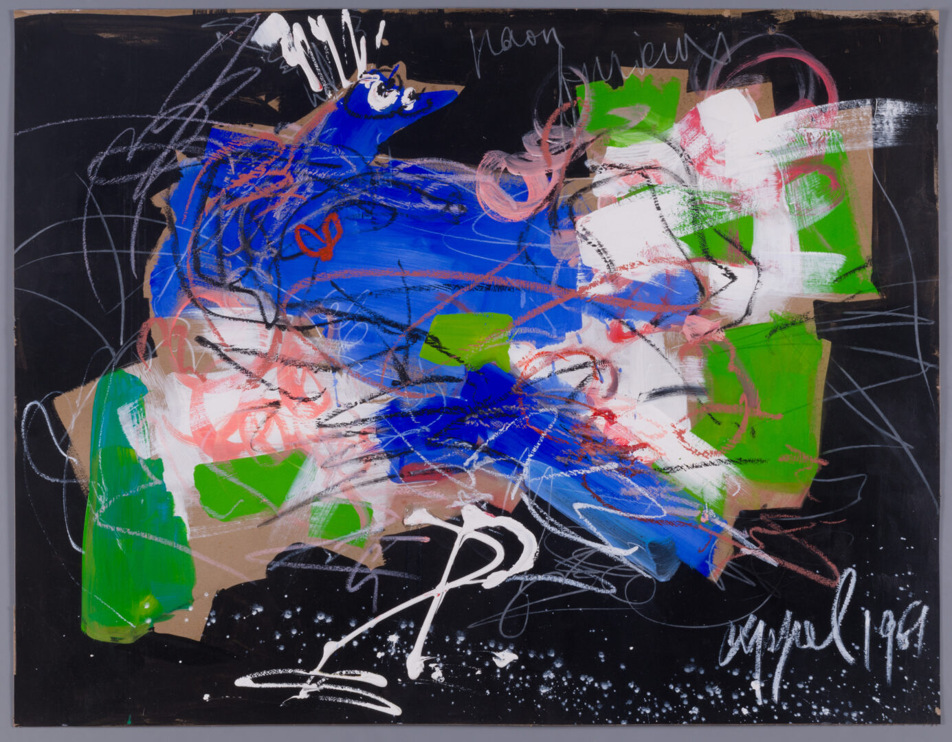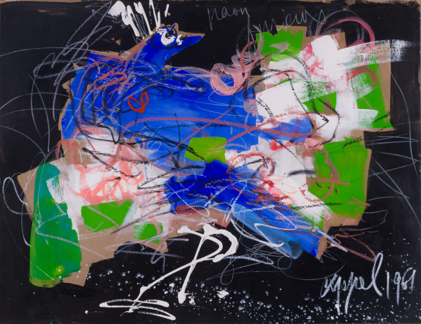 The work vibrates with a tactile, rhythmic intensity, utilizing the brown carton support as a structural element within the vibrant field of color. Swirling lines of white and black chalk dance across the surface, adding a sense of kinetic movement and psychological urgency to the animal form. This piece stands as a powerful testament to Appel’s philosophy of “liberated art,” where the act of painting becomes a physical and emotional explosion.