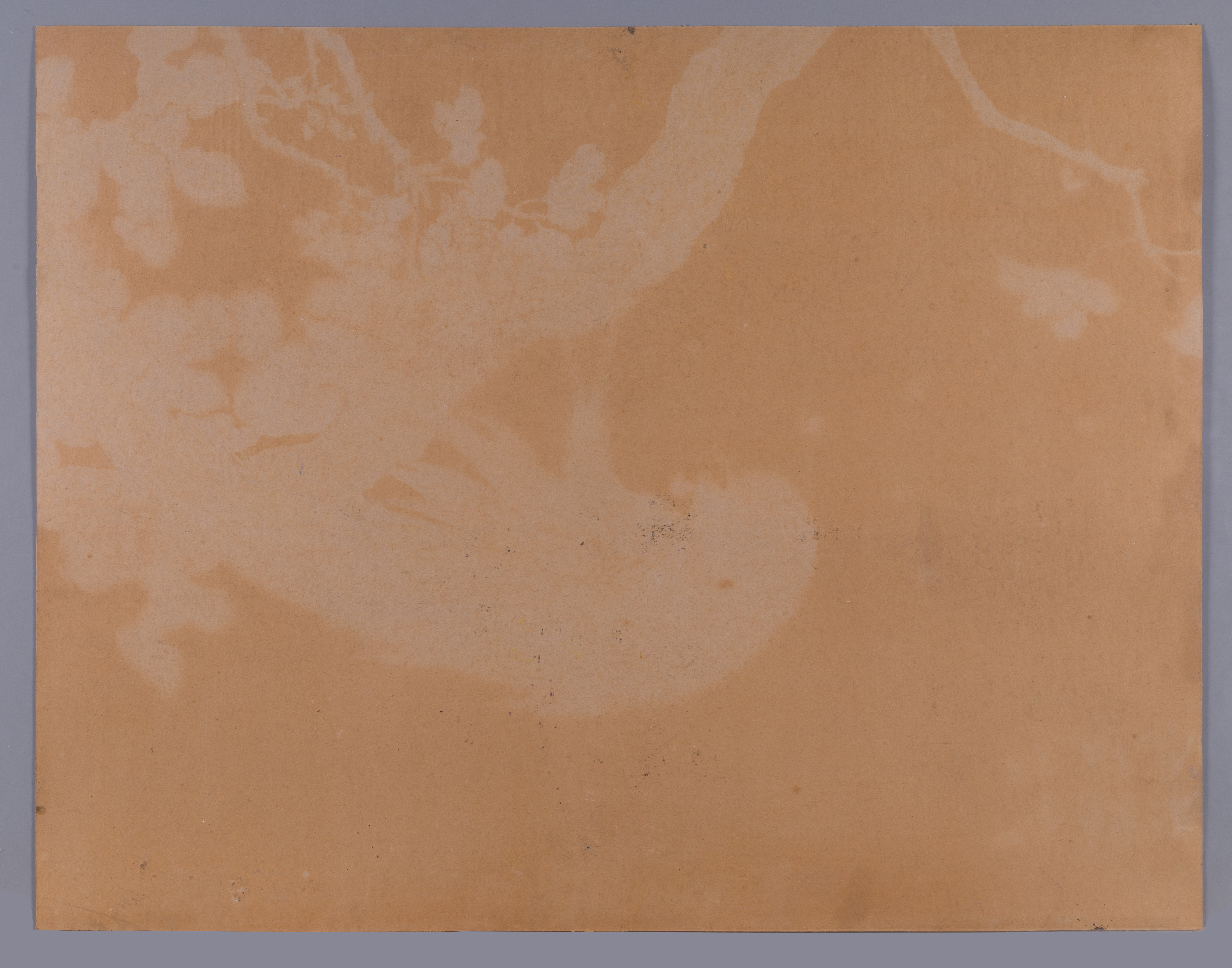 The work is in good overall condition, with the mixed media layers and pigments remaining exceptionally vibrant and well-preserved. The carton support shows minor, age-appropriate wear and slight handling marks along the unframed edges. The verso of the carton exhibits significant age-related toning and some light mottling, which is consistent with its age and material, but it does not affect the stability or appearance of the primary artwork on the front.