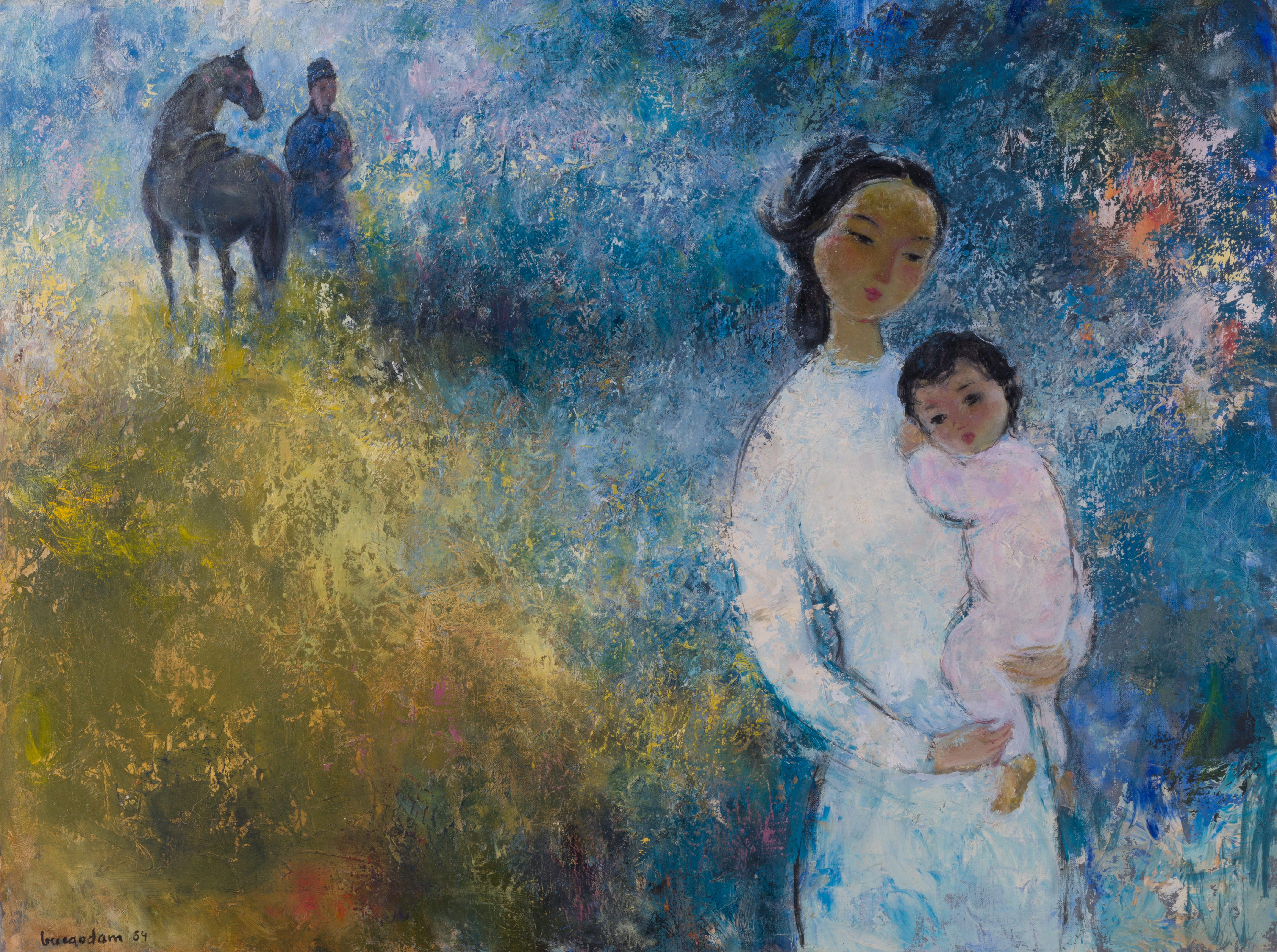 Executed in 1964, Maternité is a serene and luminous oil on canvas that perfectly captures Vu Cao Dam’s delicate fusion of traditional Vietnamese aesthetics with Western modernism. The composition features a tender depiction of a mother holding her child, a central theme in the artist’s oeuvre, set against an ethereal, impressionistic landscape. The work is characterized by a soft, atmospheric palette of blues, greens, and golden yellows, applied with light, rhythmic brushstrokes that create a sense of poetic tranquility.