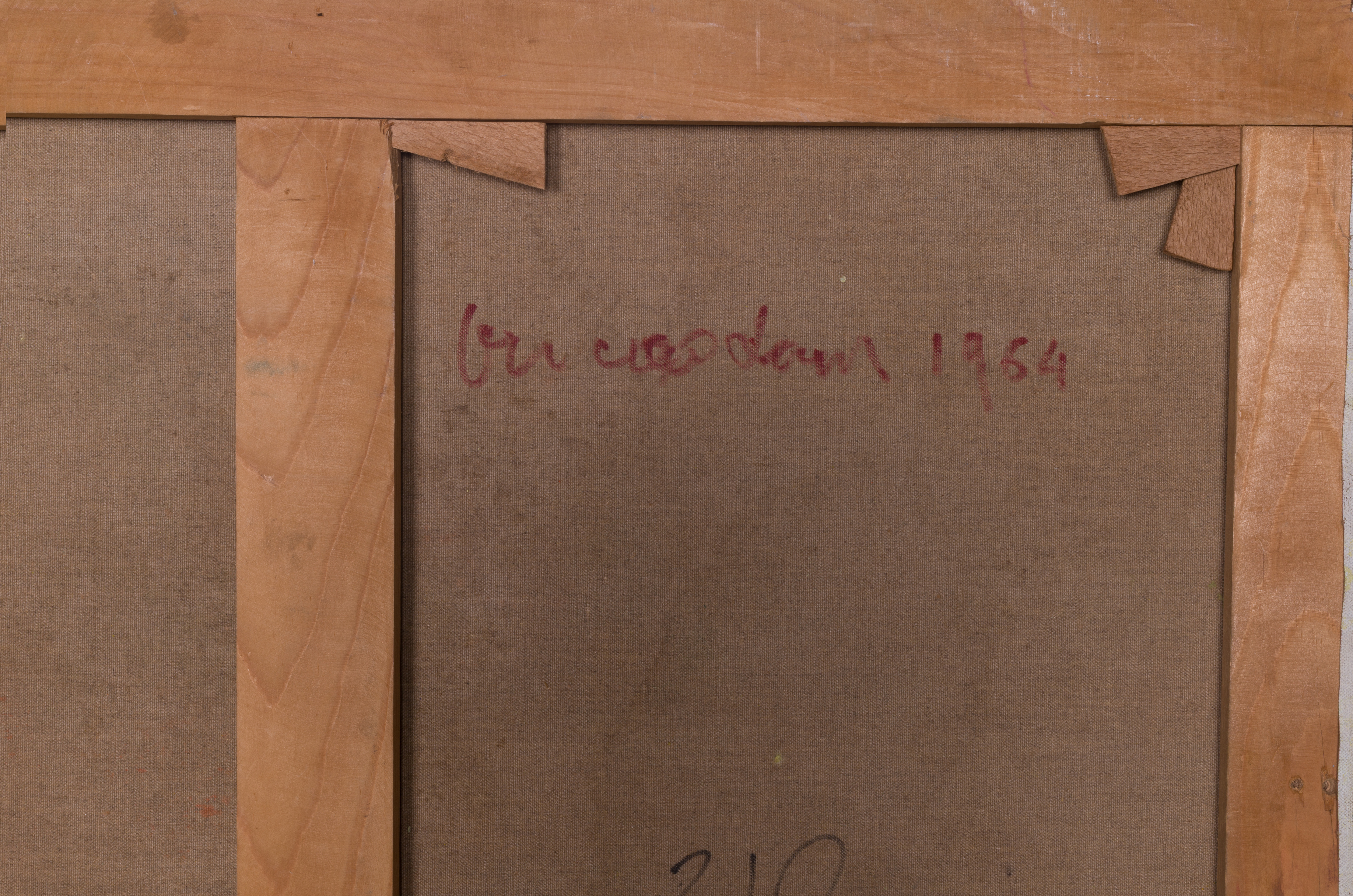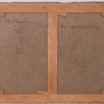 The work is in very good overall condition, with the oil pigments remaining vibrant and the impasto textures well-preserved across the canvas surface. The canvas is properly tensioned on its original wooden stretcher. There are some minor, age-appropriate handling marks along the extreme edges where the canvas meets the frame. The verso of the canvas exhibits natural age-related toning but remains clean and stable, with the artist’s original inscriptions clearly legible.