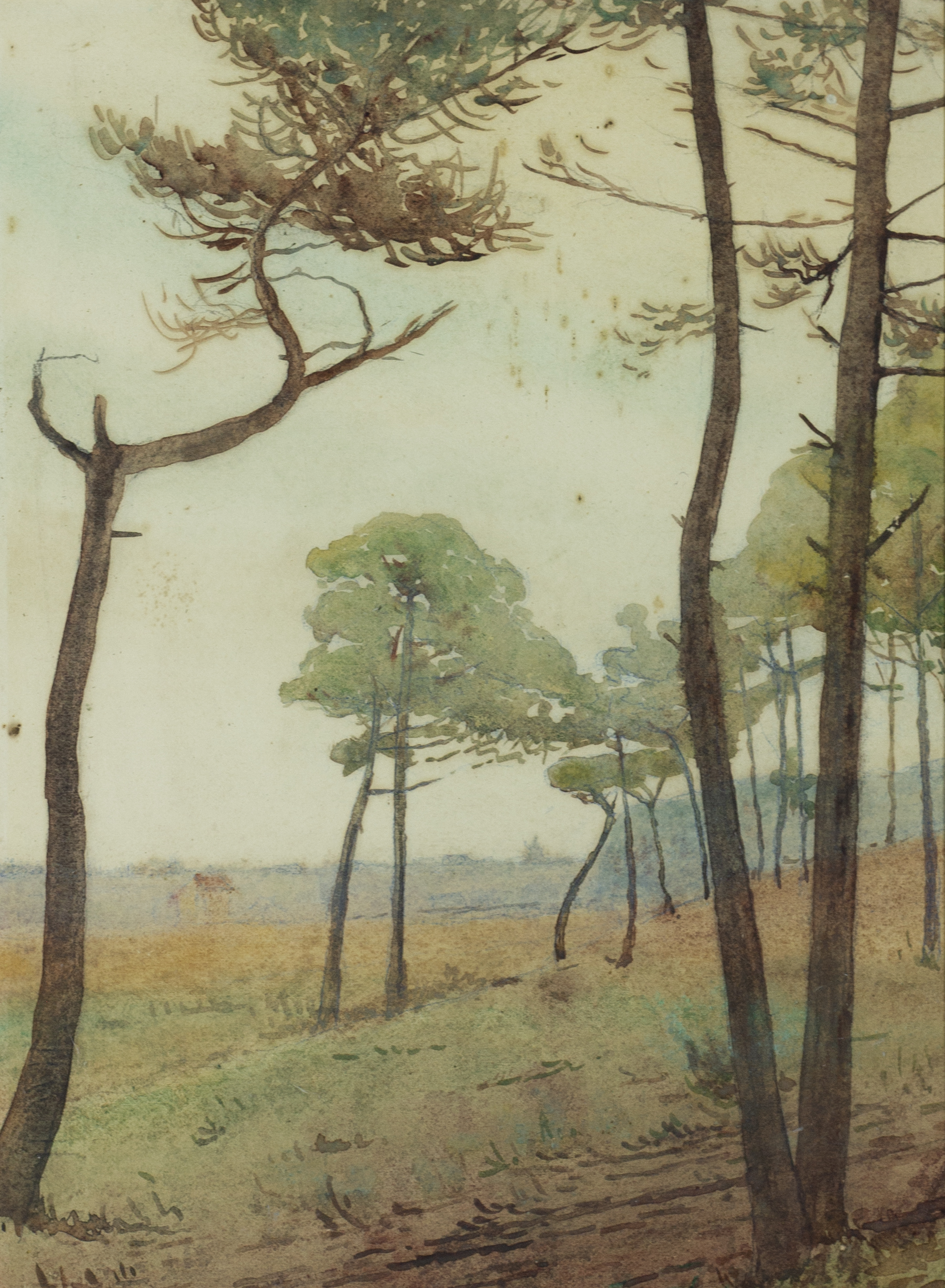 Bathed in the gentle haze of early 20th-century France, this watercolor leads us along a tranquil woodland path near Mare Louise. Tall pines rise with elegant restraint, their slender forms etched against a pale sky.