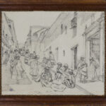 Henry Sene’s Street Market Scene is a still life of daily life, observed with quietness and composition. The drawing stretches along a narrow street full of people — women in traditional dress, children, vendors — each one drawn with precision. The perspective pulls you into the centre of the scene where the rhythm of commerce and community becomes the heartbeat of the city.