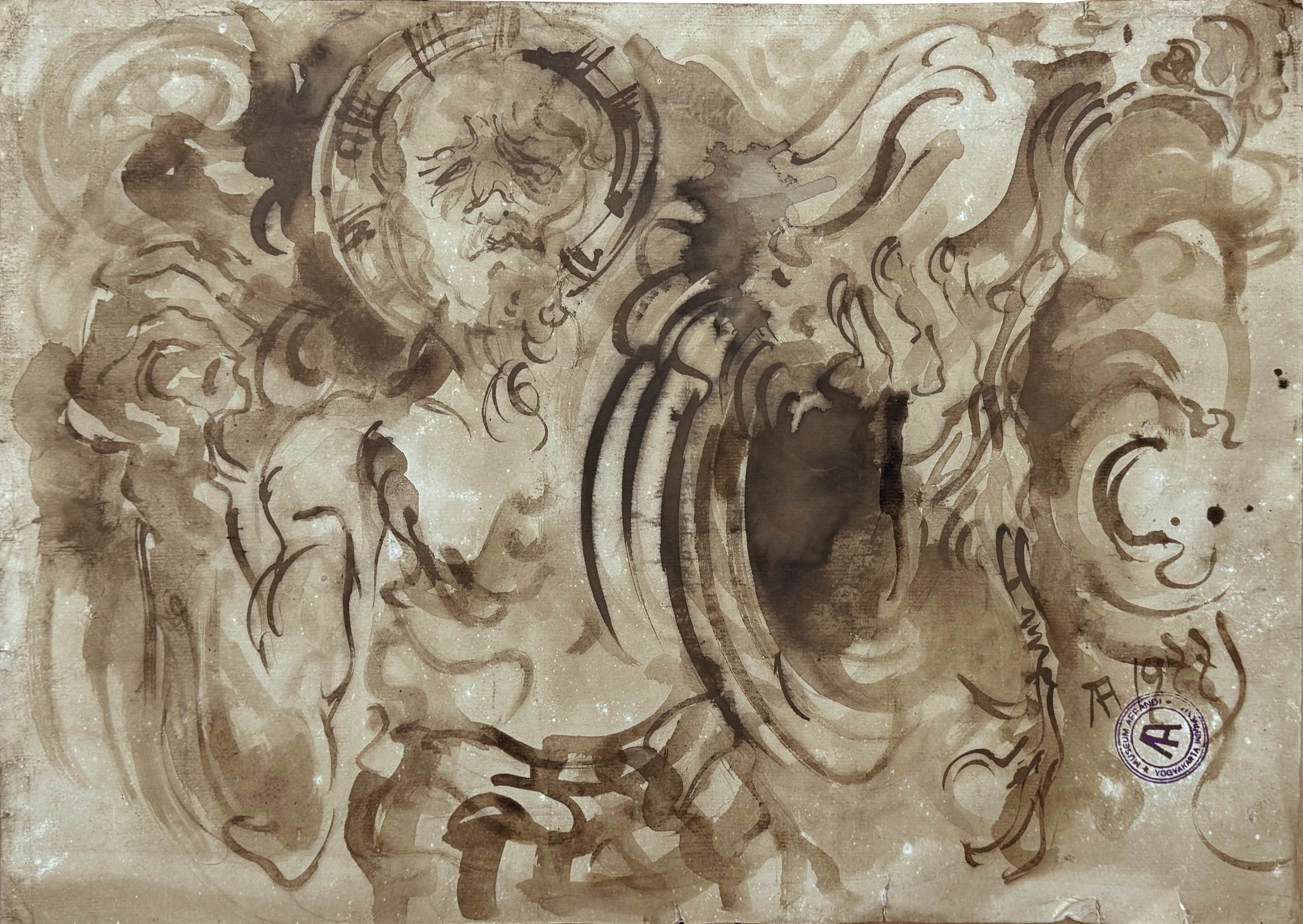 Rendered in a masterful ink wash technique, the painting captures the essence of Affandi’s unique approach to self-portraiture—where emotion and spontaneity take precedence over traditional representation. The aged patina of the paper and the official stamp further authenticate the historical and artistic value of this exceptional piece.