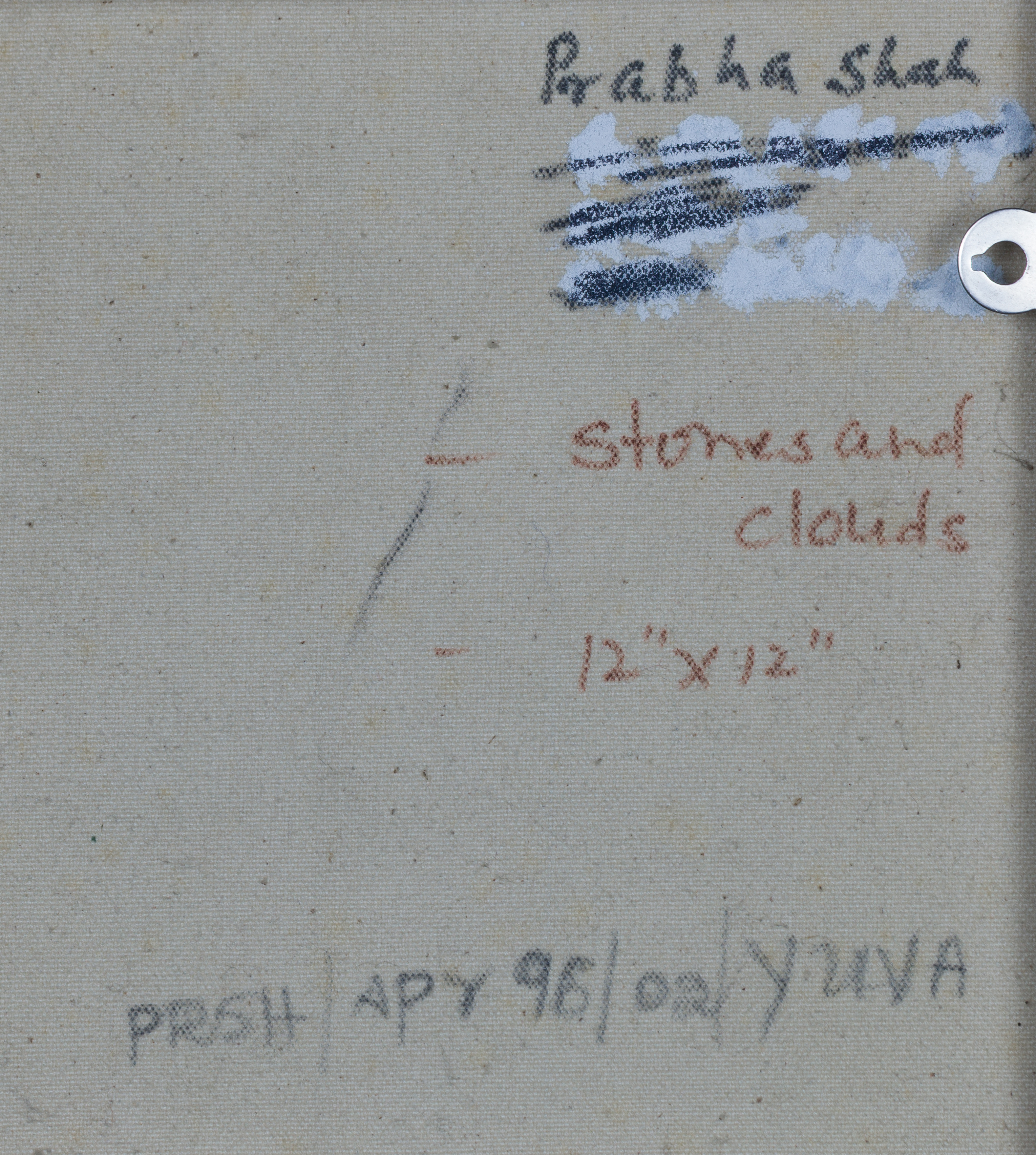 Signed ‘Prabha, 93’ lower right; inscribed ‘Prabha Shah – Stones and Clouds, 12×12’ with additional markings verso.