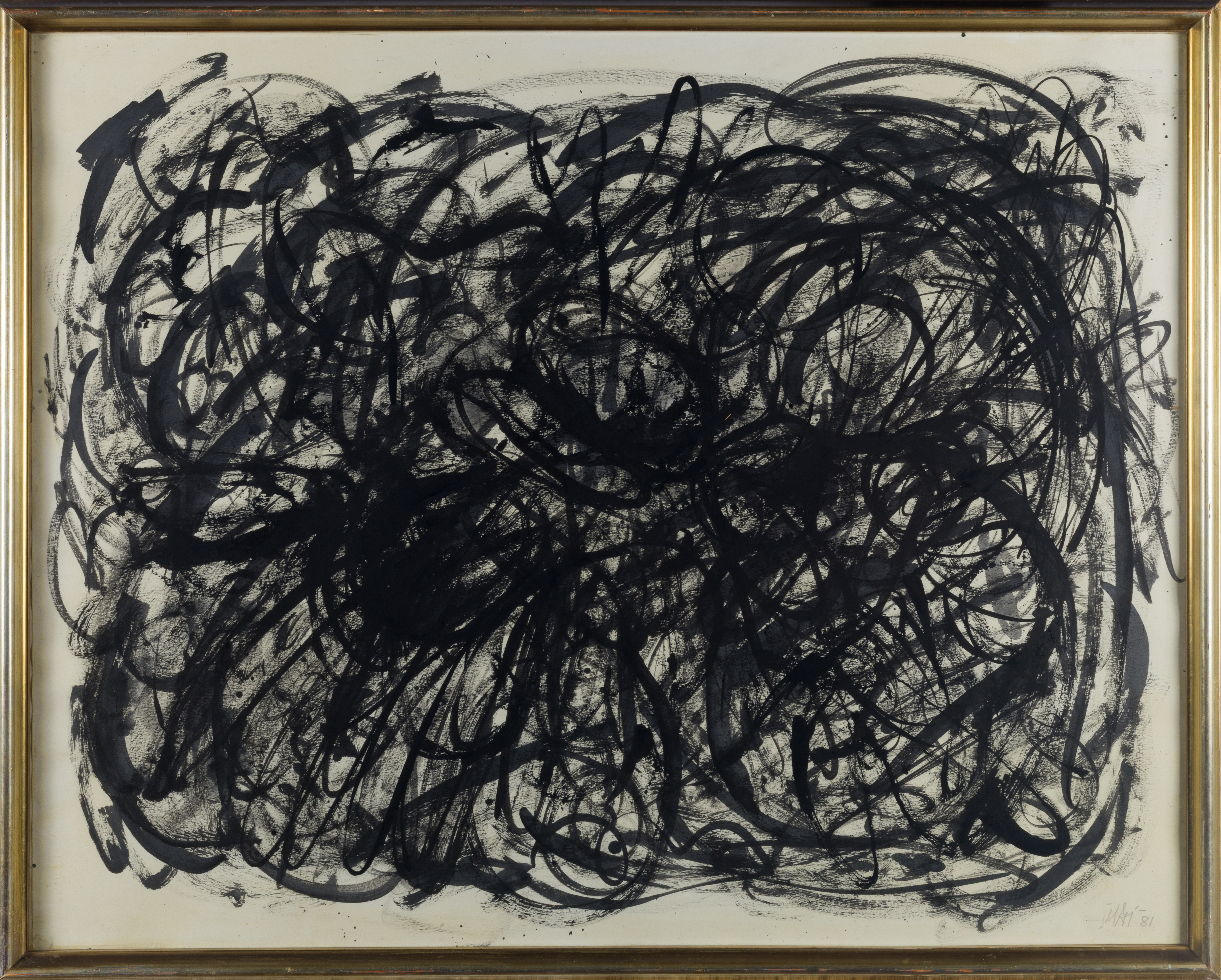 Toshimitsu Imai’s Untitled (1981) is the culmination of the artist’s late work where he combined gestural abstraction and Eastern calligraphy. Black ink arcs flow and collide on the paper like the Art Informel movement he was part of in post-war Paris. The surface is expressive of control and spontaneity — each stroke full of intention, rhythm and movement.