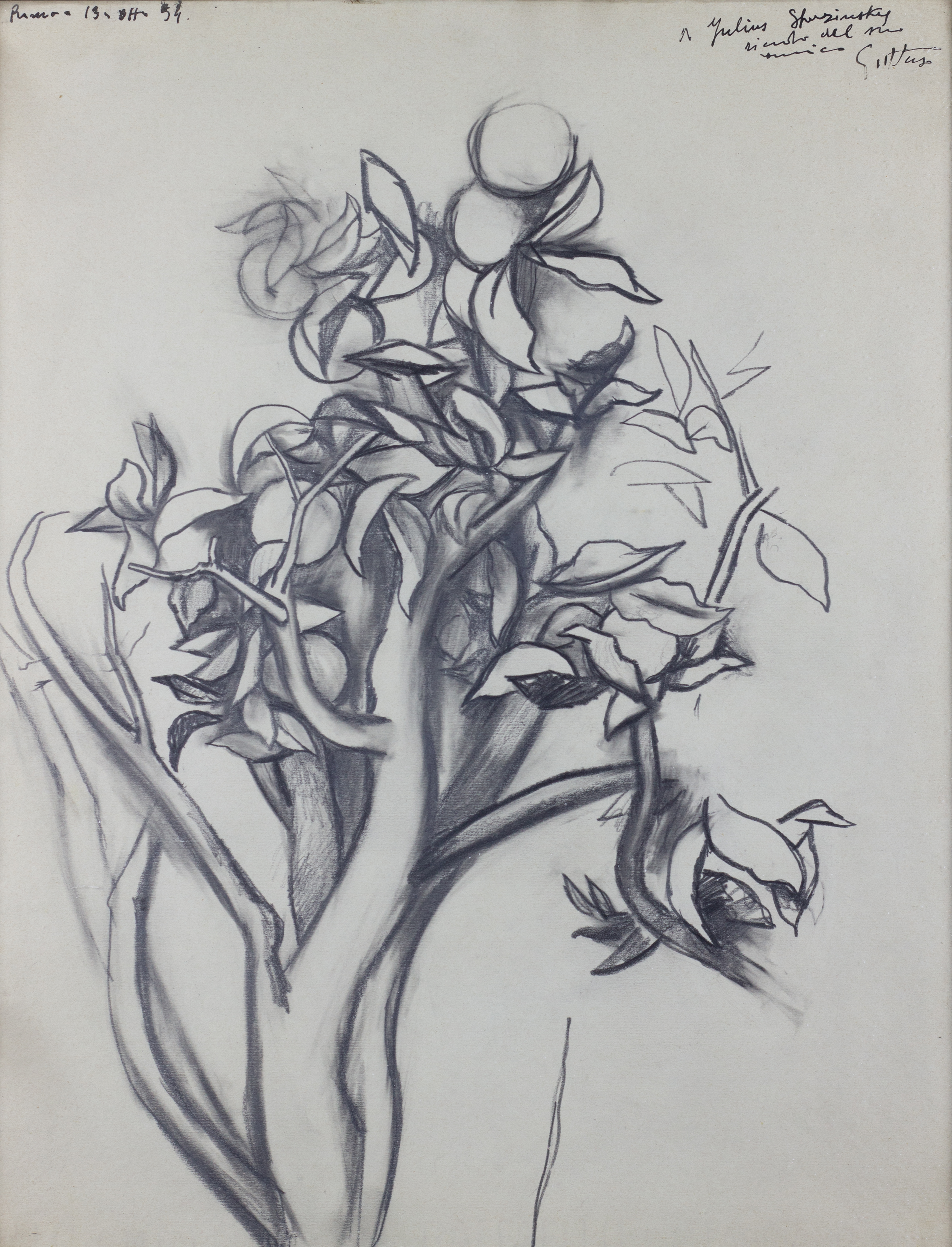 Lejos de ser un bodegón floral, esta pieza tiene un profundo significado personal e histórico. La dedicatoria y firma manuscritas del propio Guttuso y la inscripción "Roma 15. VIII. 54" anclan el dibujo en un momento concreto: la Italia de la posguerra. En el reverso, una anotación en polaco fechada en 1962 insinúa el viaje y las conexiones personales de la obra. Regalado directamente por el artista al abuelo del actual propietario, este dibujo es a la vez una reliquia artística y biográfica.